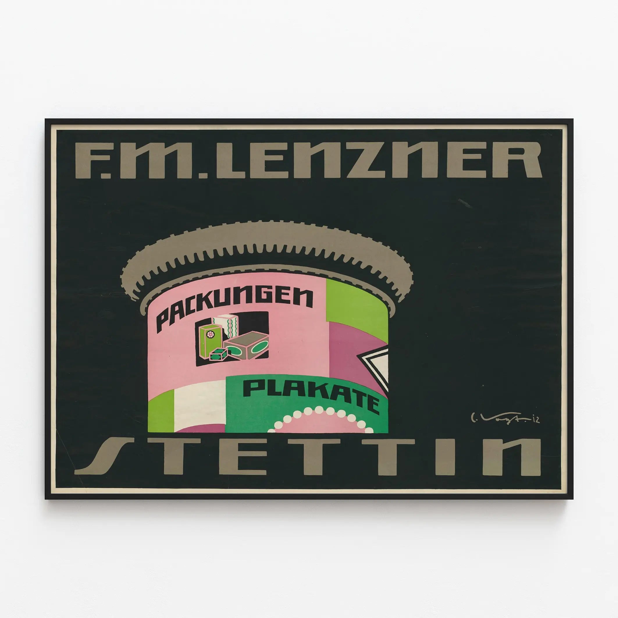 Upptäck denna vintage väggdekoration med tydlig grafisk design och färgstarka element, perfekt för att tillföra en retro och konstnärlig touch till din inredning. Denna affisch visar en illustration som påminner om en reklamsäule Morris, med färgglada skyltar som visar orden "Packungen" och "Plakate", vilket antyder en värld kopplad till förpackningar och skyltning. I mitten finns geometriska former i rosa, grönt och lila som drar till sig uppmärksamheten, och ger en dynamisk känsla med en stil som är typisk för industri- eller art déco-eran. Den djupa svarta bakgrunden förstärker färgernas livfullhet samtidigt som den skapar en elegant kontrast, perfekt som ett dekorativt konstverk i ett vardagsrum, ett kontor eller ett utställningsrum. Texten "F. M. Lenzner" upptill och "Stettin" nedtill inramar illustrationen, vilket ger en känsla av äkthet och historia till detta grafiska stycke. Denna väggdekoration är idealisk för entusiaster av vintage-inspirerade affischer med urbana och industriella influenser. Dess rena estetik och stiliserade former gör den till ett oumbärligt dekorativt inslag för att ge en vägg personlighet och charm. Oavsett om det gäller ett modernt hem där blandningen av stilar är i fokus, eller en mer klassisk atmosfär där vintage är i centrum, erbjuder denna affisch en slående visuell kvalitet. Den passar lika bra i en konstgalleri som i ett privat utrymme som vill visa ett starkt intresse för historisk grafisk design.
