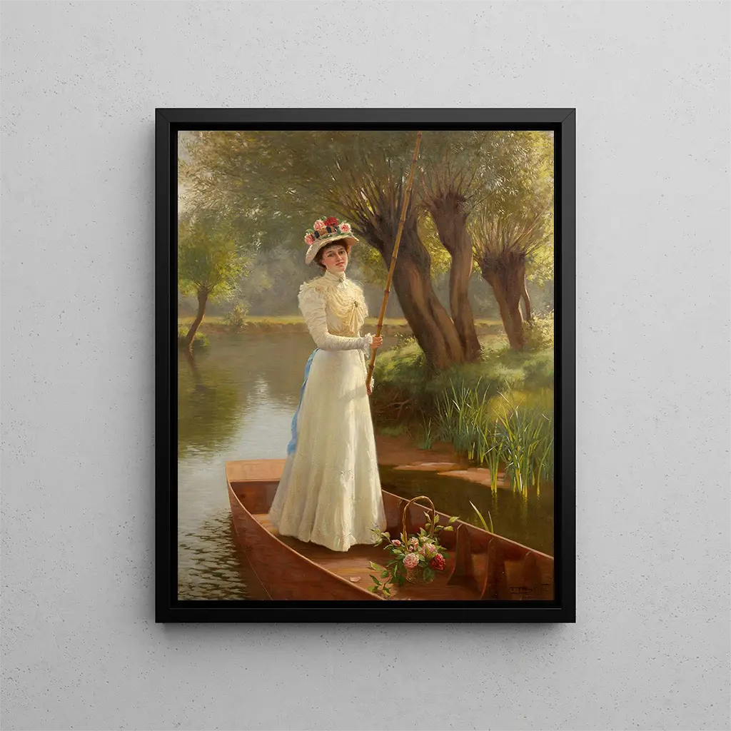 I den fascinerande konstvärlden lyckas vissa verk fånga själva essensen av ett ögonblick, en känsla, ett landskap. "Promenad med båt på Themsen - Frank Percy Wild" är ett av dessa skapelser som förflyttar betraktaren till hjärtat av den naturliga skönheten och lugnet under en eftermiddag vid den berömda floden i London. Detta verk, fyllt av frid, väcker både livsglädje och harmoni mellan människa och natur. När man betraktar denna scen känner man nästan den lätta rörelsen på vattnet och den milda brisen, en inbjudan att fly från vardagens tumult och fördjupa sig i en värld av grace och poesi.