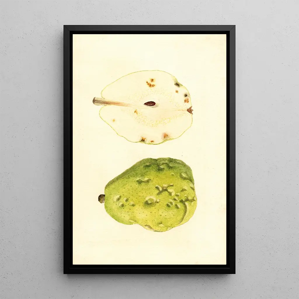 Den konsttryck av Pyrus communis Anjou framkallar delikatessen och rikedomarna hos Anjou-päron, förhöjda av mjuka färger och nyanser av grönt och gult. James Marion Shull, med sin noggranna teknik, lyckas fånga ljuset som leker över den släta ytan av frukterna, vilket skapar en lugn och varm atmosfär. Varje detalj, från bladen till skuggorna, är omsorgsfullt utarbetad och bjuder in betraktaren att fördjupa sig i en värld av harmoni och natur. Denna duk, både realistisk och poetisk, påminner oss om säsornas flyktighet och den harmoni man kan finna i livets enkla nöjen.