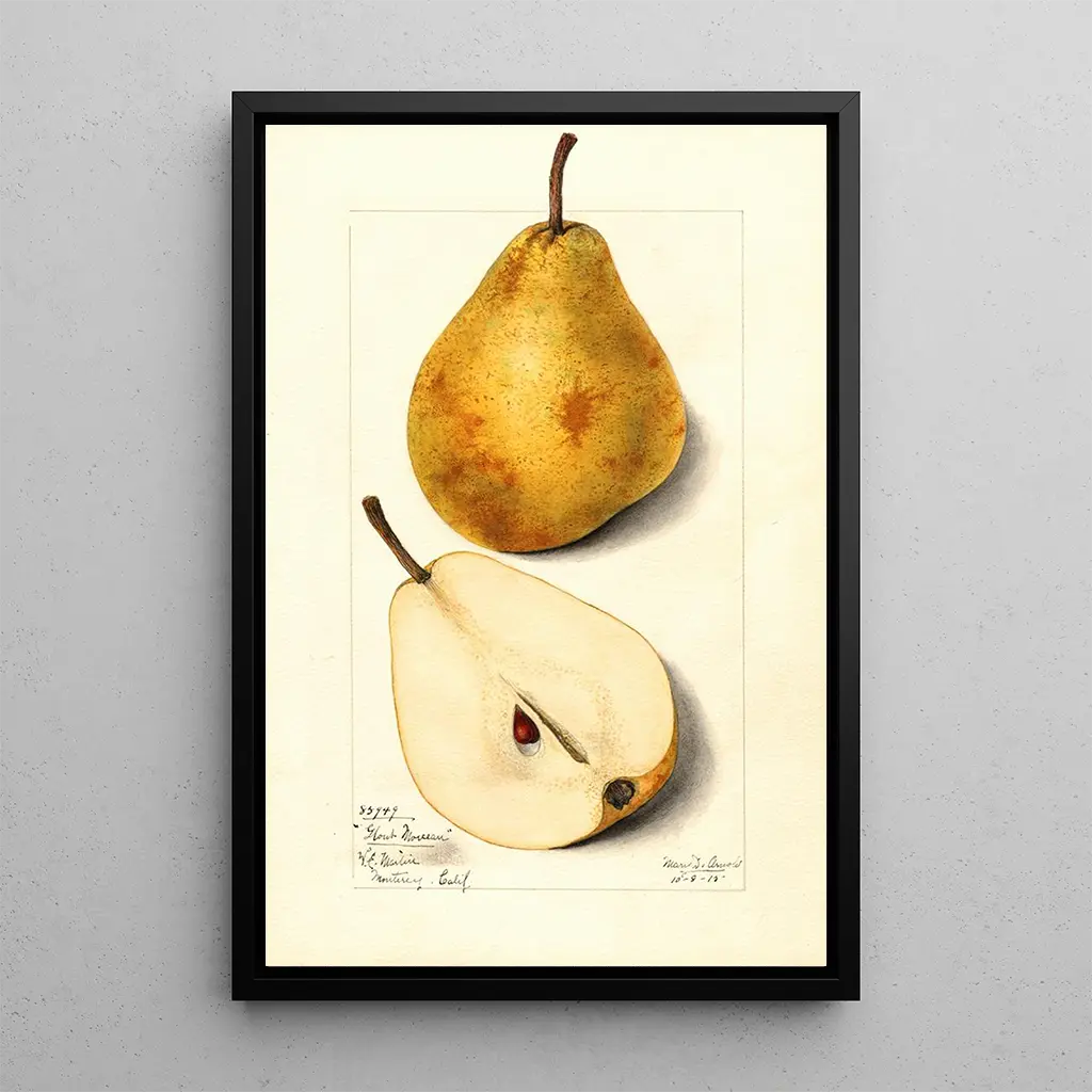 Konsttrycket av verket "Pyrus communis Glout Morceau" av Mary Daisy Arnold förflyttar oss till en värld av elegans och sötma. Denna tavla framhäver päronvarianten Glout Morceau, vars gyllene och gröna nyanser återspeglar rikedomarna i fullborda fruktträdgårdar under högsäsong. Ljuset leker över fruktens yta och skapar reflektioner som tillför djup och liv till kompositionen. Arnolds noggranna teknik gör att man nästan kan känna den saftiga texturen av päronet, vilket inbjuder betraktaren att njuta av denna visuella framställning av en enkel men utsökt frukt.