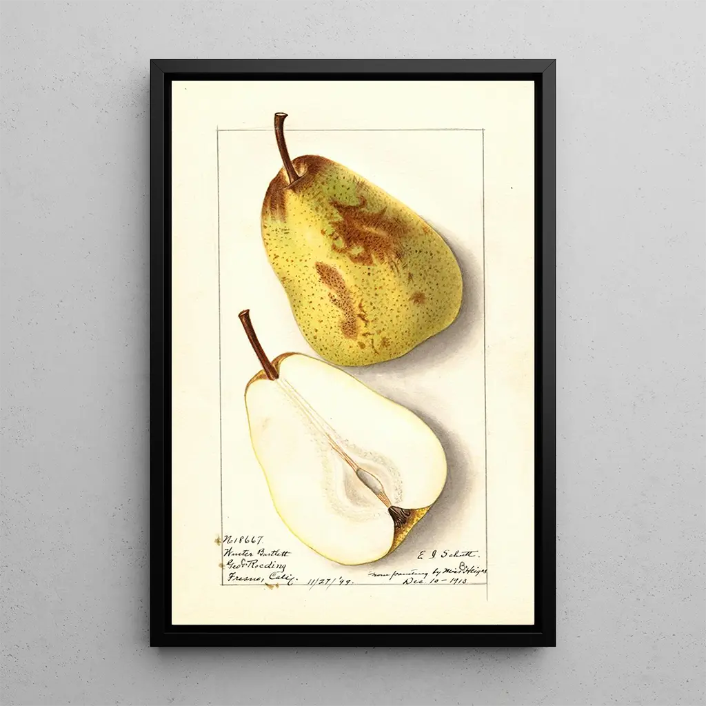 Konsttrycket Pyrus communis Winter Bartlett av Ellen Isham Schutt avslöjar en finstämd komposition där naturen blomstrar under en ljus himmel. Nyanser av grönt och gult flätas samman och skapar en varm och välkomnande atmosfär. Akvarelltekniken, med sina flytande drag och subtila övergångar, ger denna målning en lätthet och friskhet som inbjuder till eftertanke. Varje detalj, från bladen till frukterna, återges med en precision som hyllar naturens flyktiga skönhet och förvandlar ett enkelt motiv till ett verkligt konstverk.