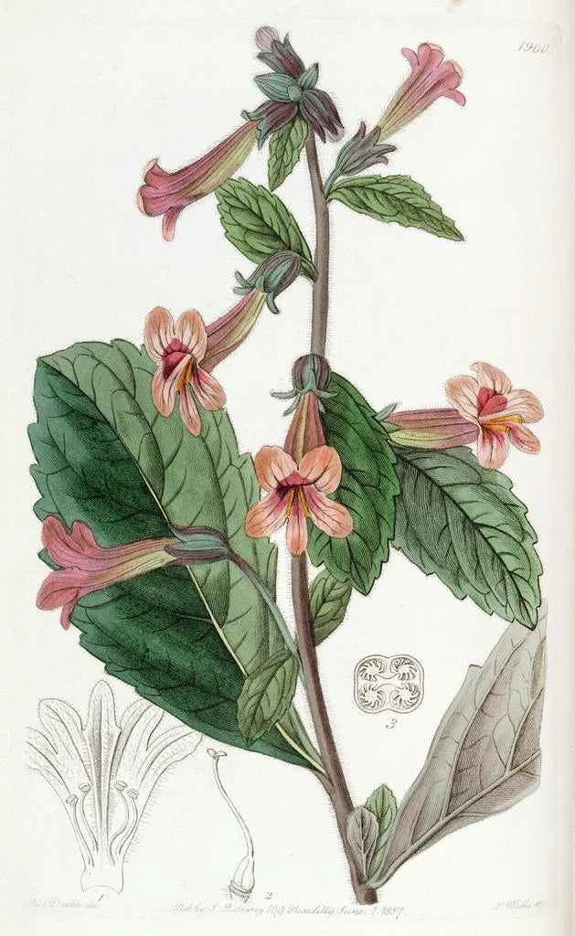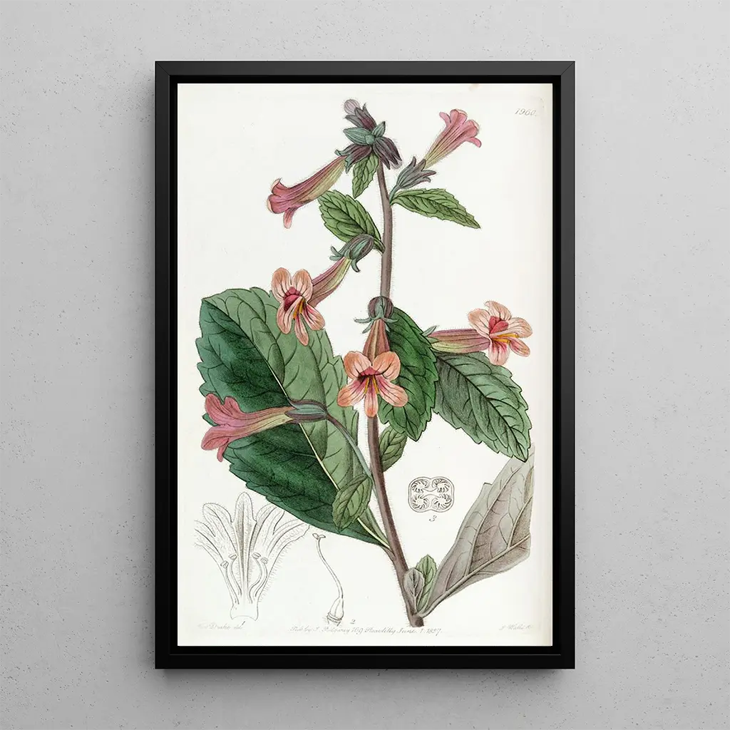 Konsttrycket av Rehmannia chinensis för oss till en värld där botanik och konst möts med elegans. De varma nyanserna av rosa och grönt flätas samman för att skapa en harmonisk komposition, som avslöjar den delikata skönheten hos denna medicinska växt. Tekniken av Sydenham Edwards, både noggrann och uttrycksfull, fångar själva essensen av Rehmannia och framkallar en atmosfär av lugn och välbefinnande. Varje detalj är omsorgsfullt återgiven, vilket inbjuder betraktaren att uppskatta naturens prakt.