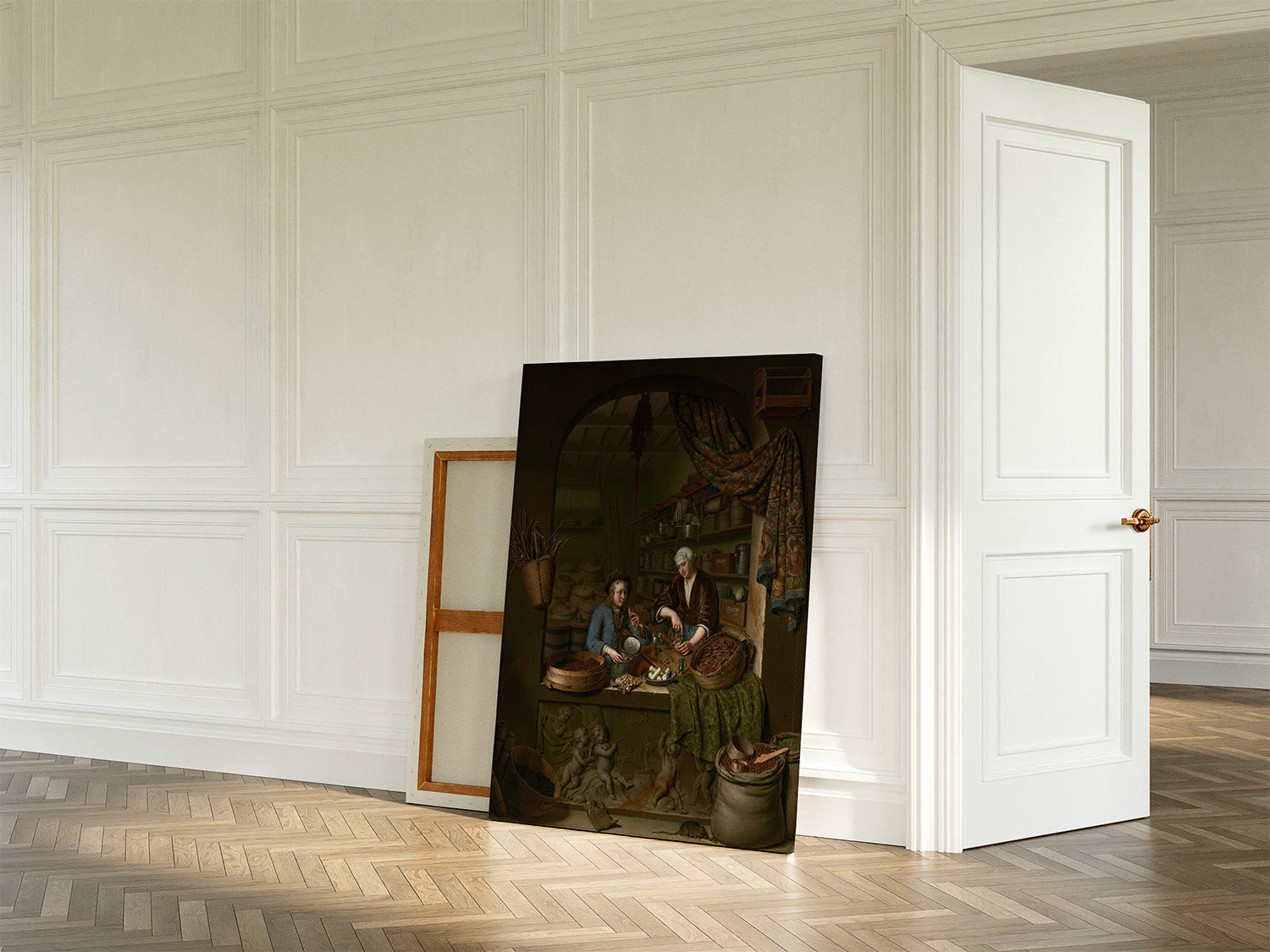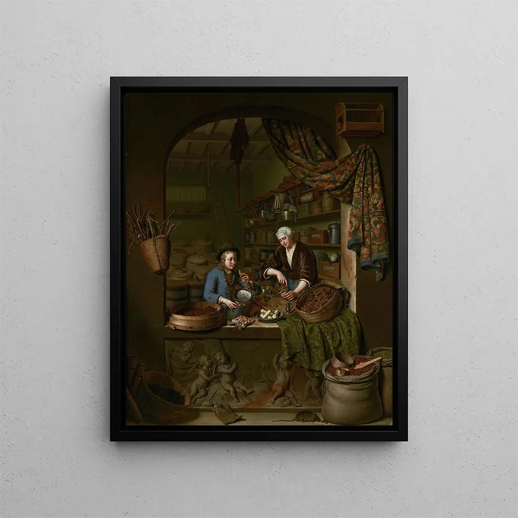 Den konsttryck av En livsmedelsbutik av Willem van Mieris är perfekt för att tillföra en touch av klassisk förfining till din inredning. Upphängd i ett kök, matsal eller vardagsrum, framhäver den gemytlighet, överflöd och sinnlig njutning. Konstälskare av holländsk målarkonst kommer att uppskatta scenens elegans, medan historieentusiaster får ett unikt vittnesmål om 1600-talets vardag.