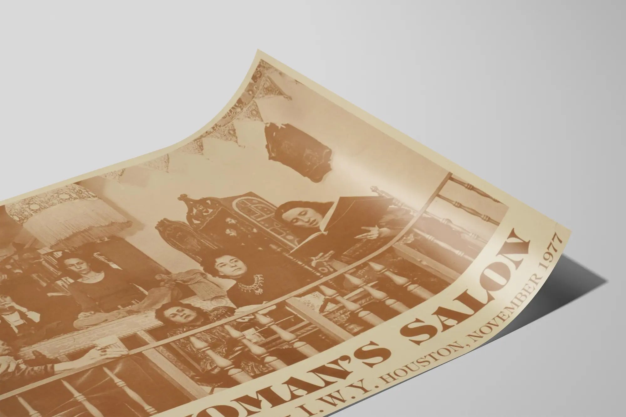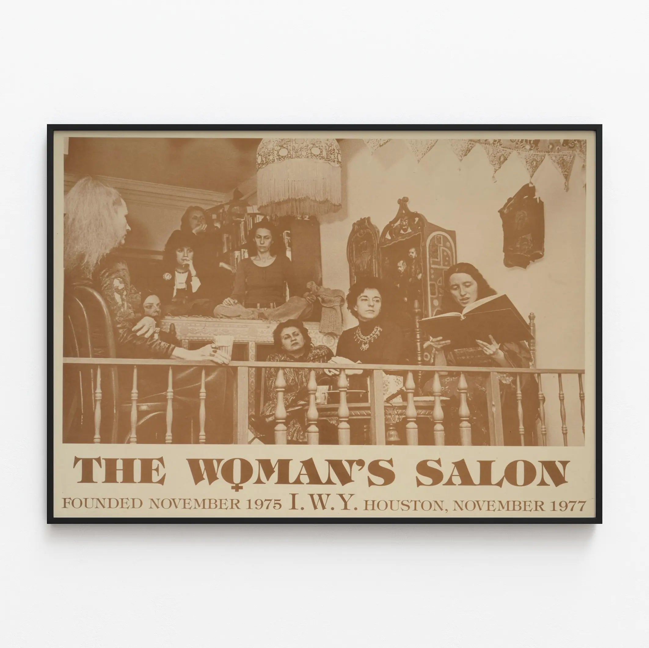Den här vintageaffischen med titeln "Kvinnans salong" fångar en intim och historiskt laddad scen, som illustrerar en grupp kvinnor samlade i ett salong, troligen i Houston i november 1977. Den sepiafärgade postern utstrålar en varm och äkta atmosfär, och lyfter fram ett viktigt ögonblick av samvaro och utbyte mellan kvinnor, sannolikt i ett sammanhang av dialog eller kollektiv studie. Som väggdekoration ger denna affisch en retro och feministisk touch till ditt hem, perfekt för entusiaster av social historia och vintage design. Designen framhäver den subtila interaktionen mellan deltagarna, deras koncentrerade hållning och allvarliga uttryck, vilket vittnar om ett djupt samtal. Den monokroma färgskalan förstärker den tidlösa känslan av bilden, vilket gör den idealisk för ett vardagsrum, ett kontor eller ett läsrum. Denna väggbild, även om den presenteras här som affisch, passar perfekt in i en samling av vintage- och historiska väggdekorationer och erbjuder en unik berättande dimension. Oavsett om du vill dekorera ett bibliotek, ett arbetsutrymme eller ett rum för reflektion, väcker detta dekorativa element både lugn och kollektiv styrka, och framstår som ett karaktärsfullt föremål. Dess breda format ger optimal synlighet och en slående väggeffekt, förstärkt av detaljer i möbler och dekorativa element i bakgrunden av bilden, vilket tillför en tydlig visuell äkthet. Denna affisch riktar sig både till entusiaster av klassisk väggdekoration och till de som gillar föremål som berättar en stark historia, särskilt inom området för kvinnors rättigheter och möten. Ge ditt hem en atmosfär som är både historisk och inspirerande med denna poster "Kvinnans salong", ett verkligt visuellt vittnesmål om en era präglad av delaktighet och frigörelse.