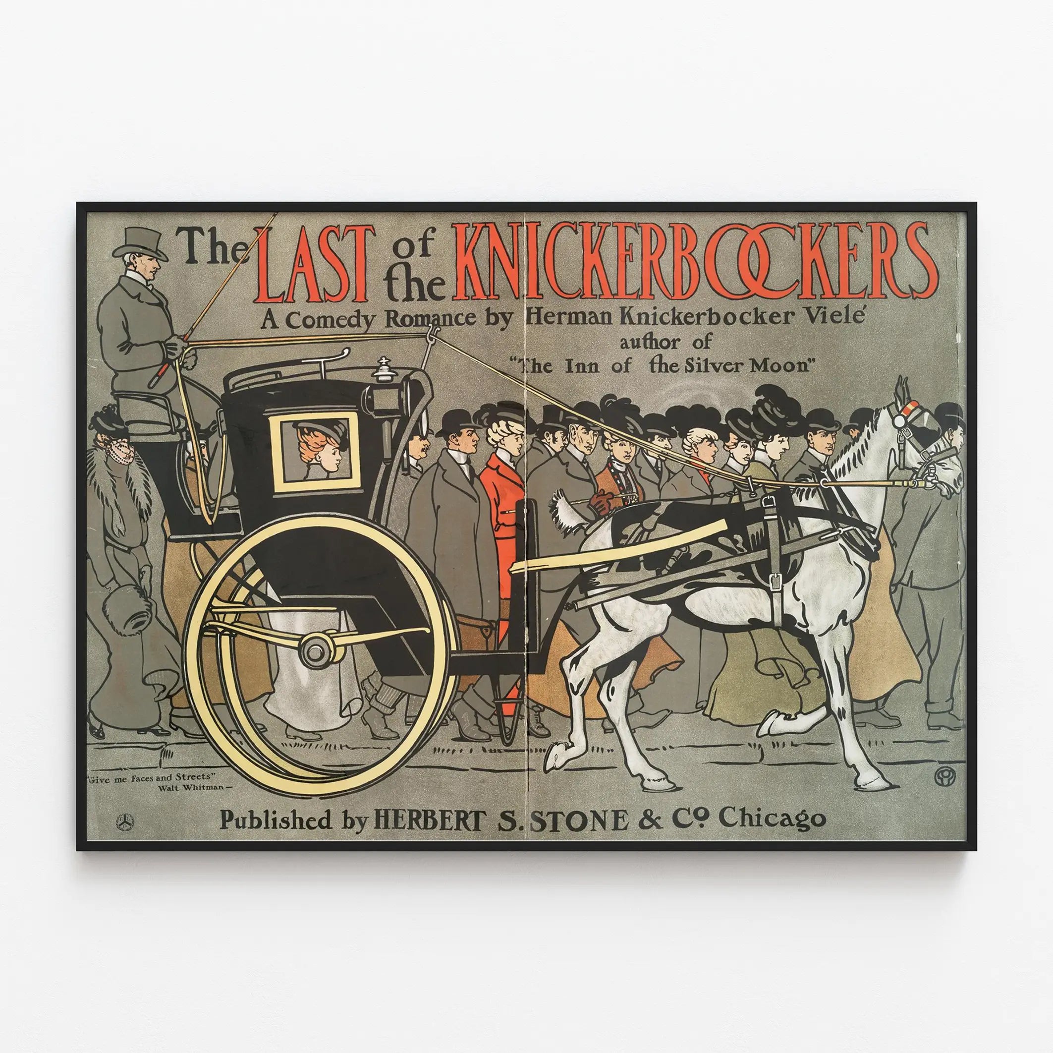 Ge en touch av elegans och historia till ditt hem med denna vintageaffisch med titeln "The Last of the Knickerbockers". Denna väggdekoration illustrerar en livlig scen från en svunnen tid, där en hästvagn dras av en vit häst och rör sig i långsam takt, omgiven av flera figurer klädda i en klassisk stil från början av 1900-talet. Den grafiska sammansättningen framhäver en harmonisk blandning av dämpade och varma nyanser, dominerade av grått, svart, vitt och inslag av orange-rött som framhäver titeln i versaler.