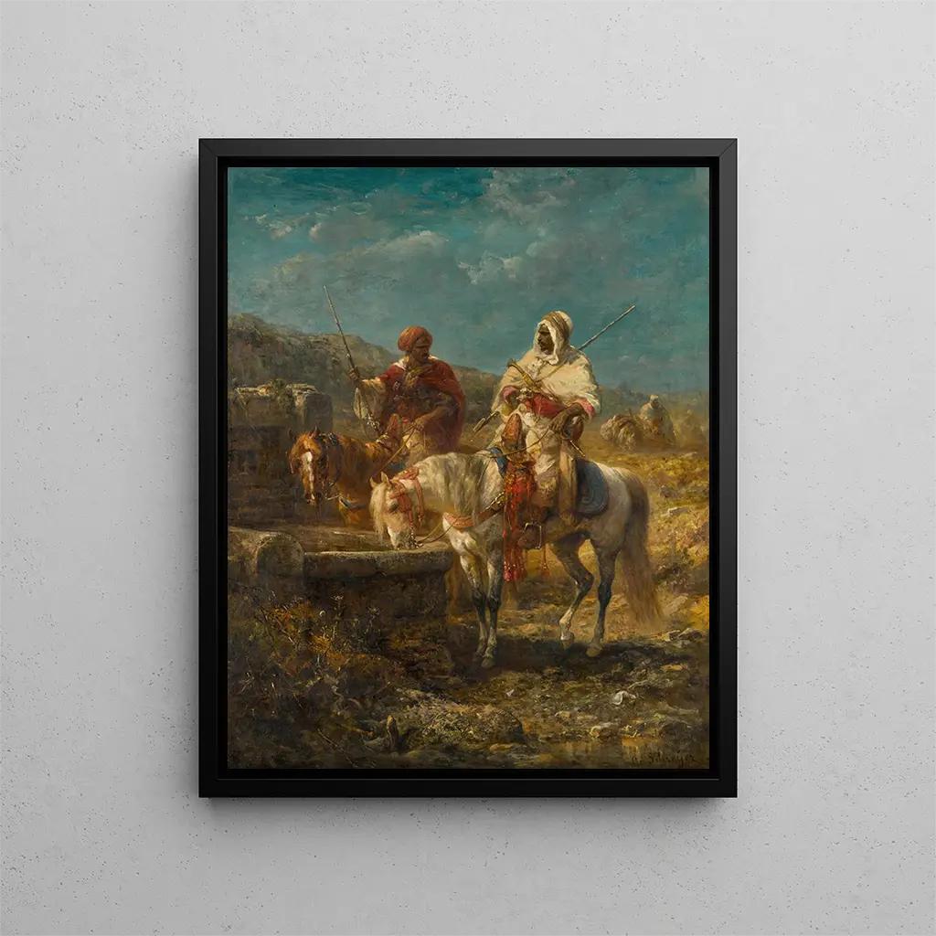 Adolf Schreyers stil kännetecknas av noggrann uppmärksamhet på detaljer och en färgpalett som är livfull och ger en unik dynamik till hans kompositioner. I "Cavaliers vid brunn" sprider sig ljuset harmoniskt över figurerna och det omgivande landskapet, vilket skapar en slående kontrast mellan skuggor och ljus. Hästarna, majestätiska och kraftfulla, är avbildade med anatomisk precision som vittnar om konstnärens passion för ridning och natur. Ryttarnas graciösa rörelser, i kombination med brunnens lugn, framkallar en atmosfär av fred och gemenskap. Varje element i målningen är noggrant arrangerat, vilket ger en rik och komplex läsning som fångar ögat och sinnet.