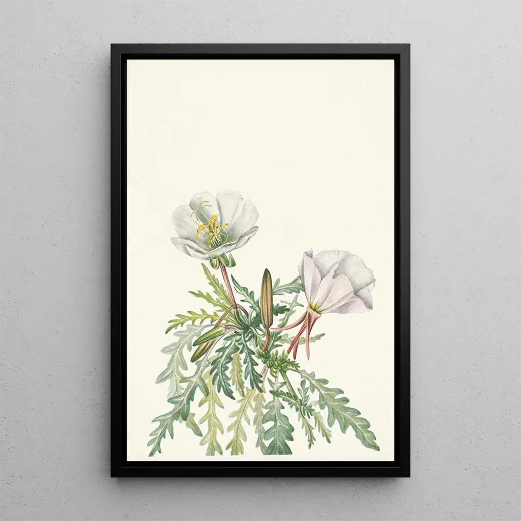 Konsttrycket av "Rose de l'aube blanche" av Mary Vaux Walcott framkallar en sällsynt delikatess, fångar den flyktiga skönheten hos en ros vid gryningen. Nyansen av vitt och rosa, subtilt blandade, skapar en mjuk och lugnande atmosfär. Akvarelltekniken, använd med mästerskap, gör det möjligt att återge genomskinligheten hos blommornas kronblad och morgonens ljus. Varje detalj, från daggdroppar till delikata skuggor, bidrar till en harmonisk komposition som inbjuder till eftertanke. Detta verk är en sann hyllning till naturen, som avslöjar konstnärens passion för botanik och blomsters skönhet.