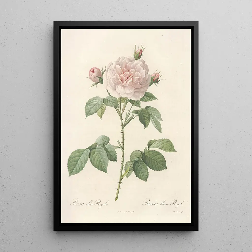 Pierre Joseph Redouté, verksam på 1700-talet, är erkänd som en av de största botaniska illustratörerna i sin tid. Född i Belgien, blev han snabbt känd vid det franska hovet, där han blev målare för Marie-Antoinettes blommor. Hans stil, som förenar vetenskaplig noggrannhet med konstnärlig känsla, gör honom till en pionjär inom området för blomsterillustration. Rosa Alba Regalis, liksom många av hans verk, vittnar om hans talang att fånga rosornas naturliga skönhet samtidigt som han respekterar deras botaniska struktur. Hans inflytande består, och inspirerar många konstnärer och botaniker.