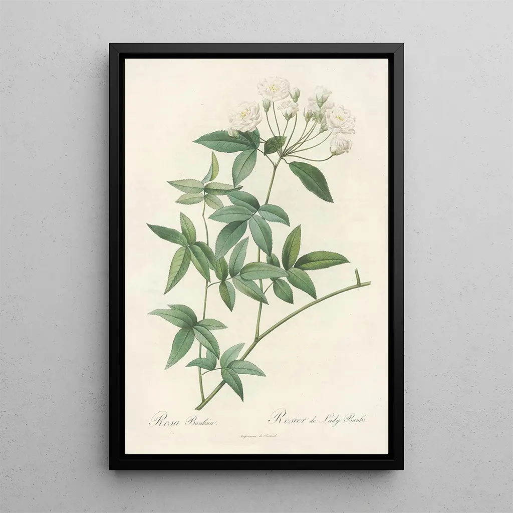 Konsttrycket av Rosa Banksiae är ett perfekt dekorativt val för den som vill tillföra naturens skönhet till sitt hem. Oavsett om det är i ett vardagsrum, ett kontor eller ett sovrum, passar denna canvas perfekt in i olika inredningsstilar, från klassiskt till modernt. Dess utskriftskvalitet garanterar en trohet mot detaljerna i originalverket, vilket gör det möjligt att fullt ut uppskatta skönheten hos denna ros. Genom att lägga till detta konsttryck i din samling ger du ditt utrymme en frisk och elegant touch, samtidigt som du hyllar Pierre Joseph Redoutés blomsterkonst.