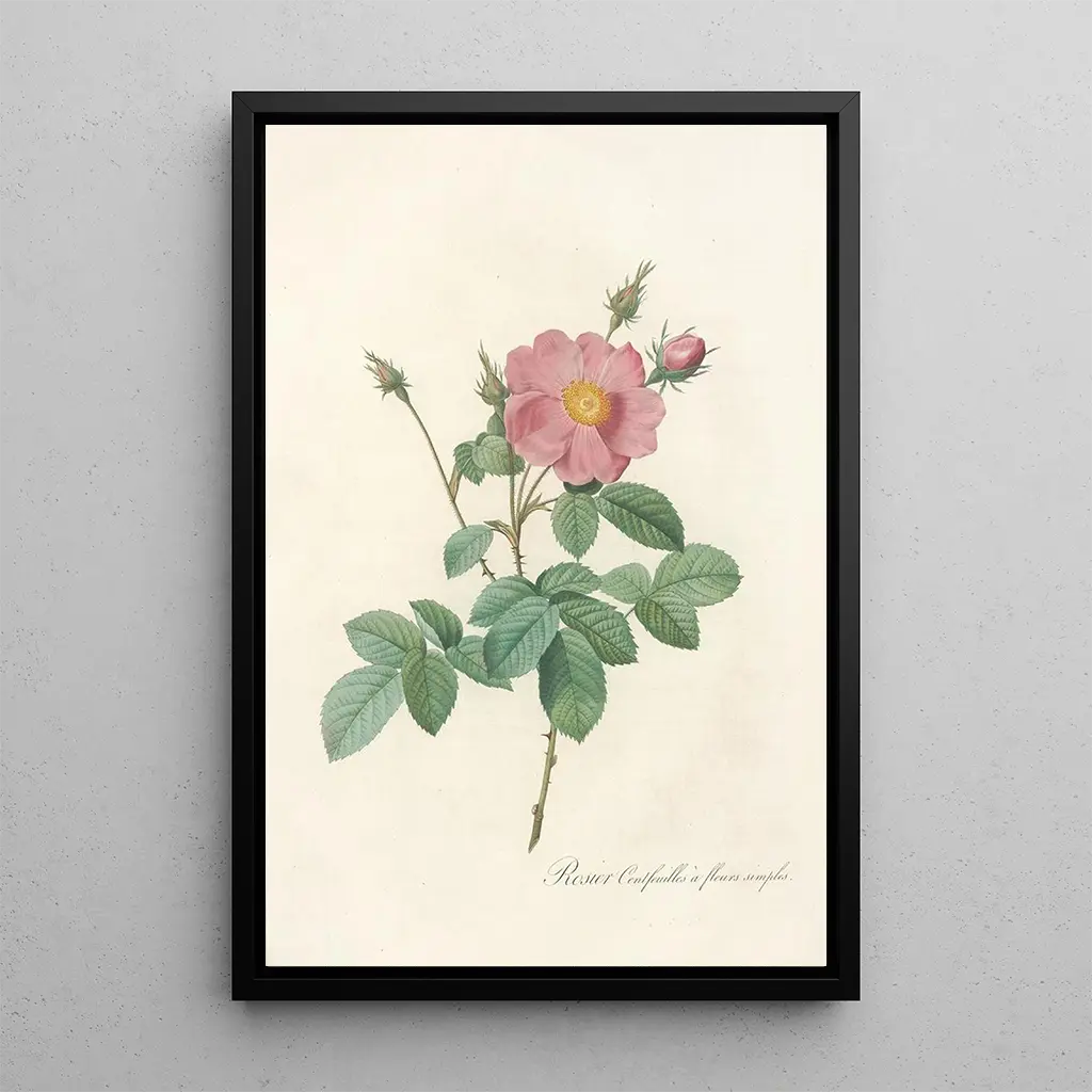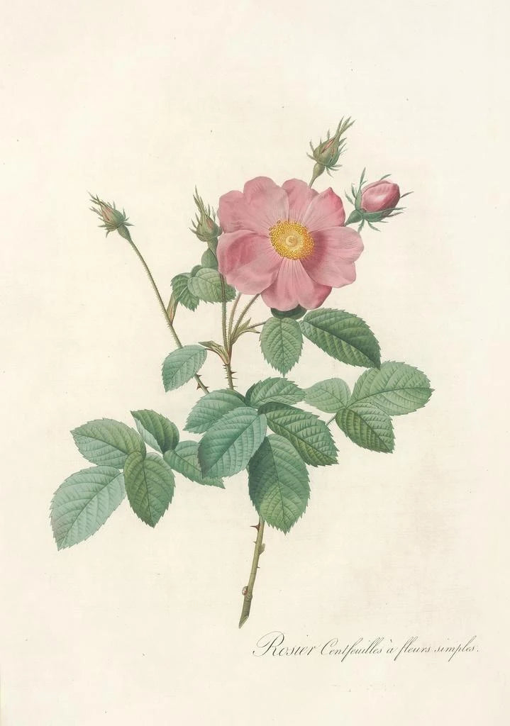 Pierre Joseph Redouté, en framstående figur från 1700-talet, är känd för sina blomsterillustrationer som förenar konst och vetenskap. Hans arbete påverkades av kungliga trädgårdar och han hade äran att måla för det franska hovet, särskilt för Marie-Antoinette. Redouté lyckades fånga blommornas skönhet med sådan precision att han ofta anses vara pionjär inom botanisk illustration. "Rosa Centifolia Simplex" är ett av hans ikoniska verk, som vittnar om hans exceptionella talang och hans engagemang för en trogen skildring av naturen.