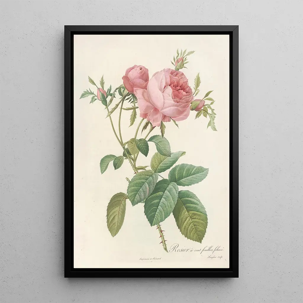 Konsttrycket av Rosa Centifolia Foliacea av Pierre Joseph Redouté fördjupar oss i en värld av mildhet och elegans. Detta konsttryck, med sina pastellfärger och noggranna detaljer, återspeglar den flyktiga skönheten hos rosor. Nyansen av grönt och rosa vävs samman harmoniskt och skapar en lugnande atmosfär som inbjuder till eftertanke. Redoutés akvarellteknik gör att varje blomblad nästan är genomskinligt, fångar ljuset på ett sätt som ger liv åt växten. Hela verket utstrålar en fridfullhet som fångar ögat och väcker sinnena, som en hemlig trädgård att utforska.