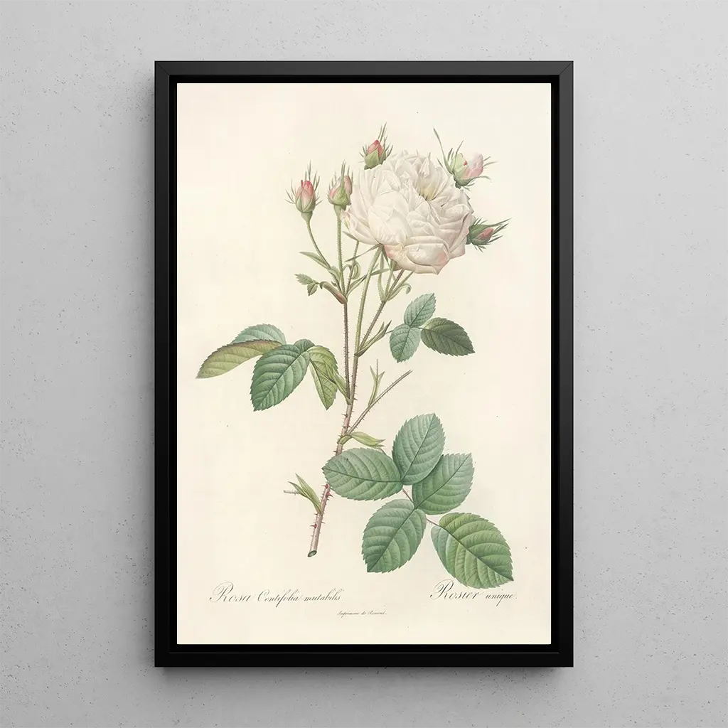 Pierre Joseph Redouté, född 1759, är erkänd som en av de största botaniska konstnärerna från sin tid. Hans karriär i Paris, där han var hovets blomstermålare, gav honom möjlighet att skapa ett oöverträffat rykte. Påverkad av neoklassicism och de vetenskapliga framstegen under sin tid, lyckades Redouté fånga växternas skönhet med en unik precision och känslighet. Rosa Centifolia Mutabilis är ett av hans mästerverk, som illustrerar hans talang för att avbilda naturen samtidigt som han respekterar de botaniska detaljerna. Hans verk fortsätter att inspirera botanikkunniga och konstälskare.