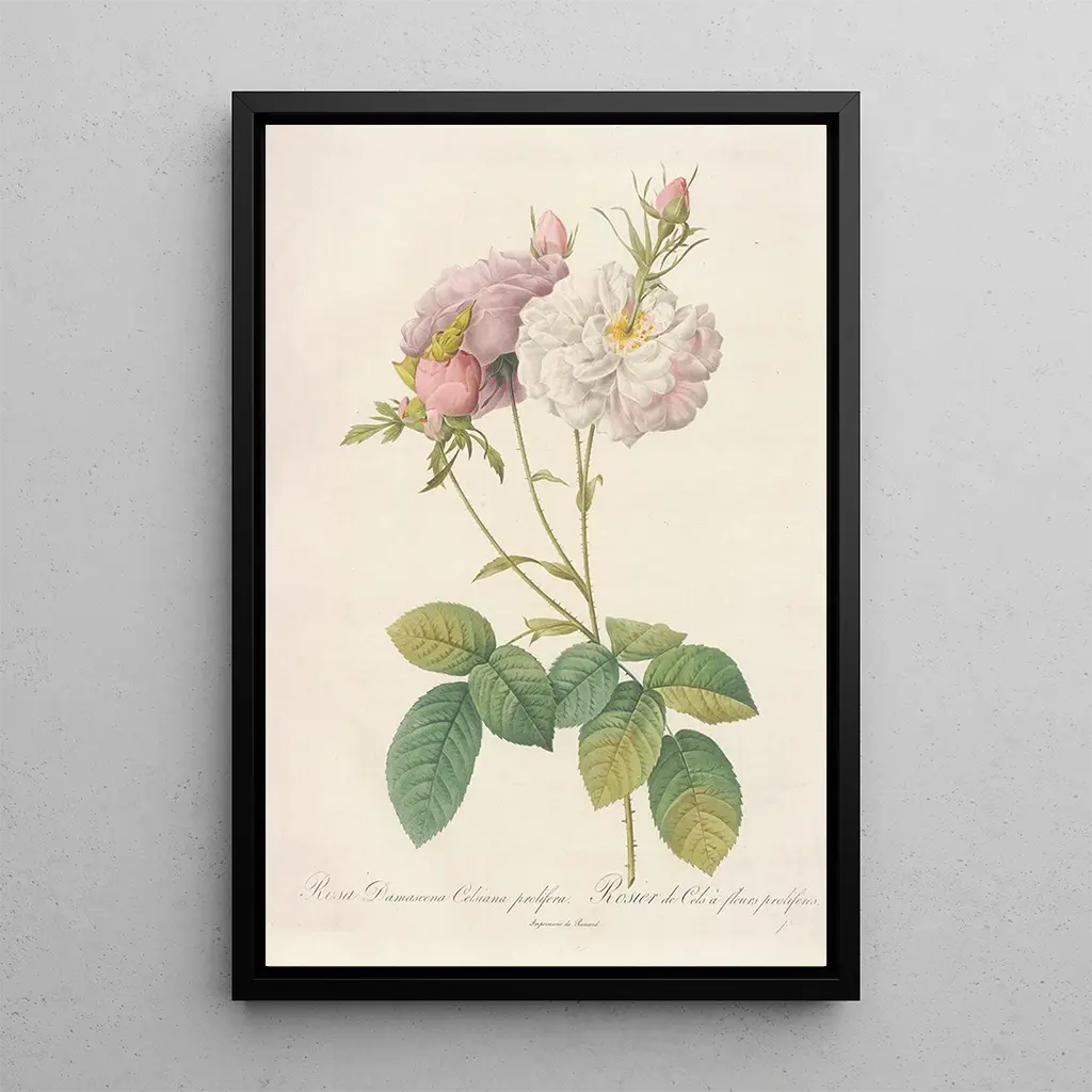 Pierre Joseph Redouté, en framstående figur från 1700-talet, är erkänd för sin exceptionella talang i att avbilda blommor. Hans arbete, influerat av de botaniska framstegen under sin tid, har varit mycket uppskattat vid det franska hovet, där han skapade många verk för drottning Marie-Antoinette. Redouté lyckades förena konst och vetenskap, vilket gjorde hans akvareller till referenser inom botanik. Rosa Damascena Celsiana Prolifera är ett perfekt exempel på hans kunnande, som illustrerar skönheten hos rosor med en oöverträffad precision och känslighet.