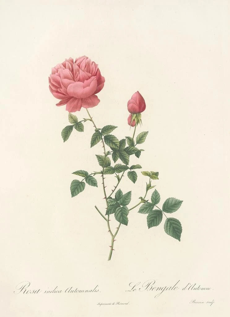 Konsttrycket av Rosa Indica Automnalis framkallar magin av höstrosor, när deras färger tonas i varma och gyllene nyanser. Blommans kronblad, noggrant målade, verkar fånga ljuset från en avtagande sol och skapar en varm och tröstande atmosfär. Akvarelltekniken, som behärskas av Pierre Joseph Redouté, gör det möjligt att återge transparensen och finheten i varje blomma, vilket bjuder in till förundran inför naturens skönhet.