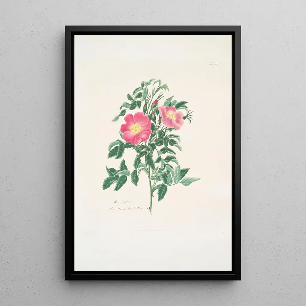 Konsttrycket av Rosa carolina, skapad av Mary Lawrance, framkallar en vild och äkta skönhet. Denna målning, med sina livfulla nyanser av rosa och grönt, fångar essensen av vilda rosor som växer på fälten. Blommorna, strålande och fulla av liv, framhävs av en fin bakgrund som förstärker deras glans. Lawrances teknik, som kombinerar precisa penseldrag och subtila nyanser, skapar en atmosfär som är både dynamisk och lugn. Varje blomblad verkar berätta en historia och bjuder in betraktaren att utforska naturens rikedom.