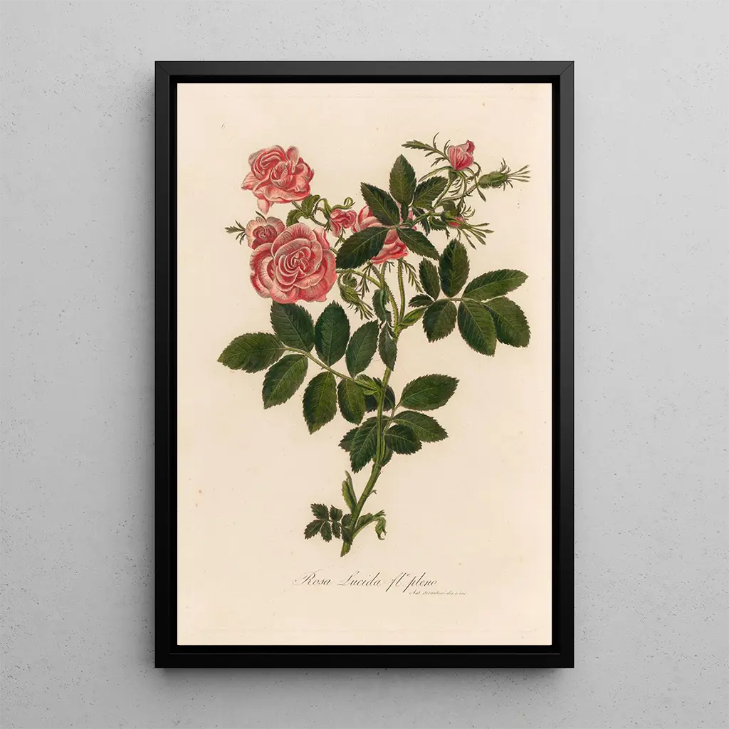 Konsttrycket av Rosa lucida fle pleno fördjupar oss i en finstämd värld där varje blomblad tycks vibrera under ljuset. Nyanser av rosa och grönt flätar sig harmoniskt samman och skapar en mjuk och lugnande atmosfär. Akvarelltekniken, som används med mästerskap, ger liv åt denna blomma och gör nästan taktil texturen av dess blomblad påtaglig. Verket inbjuder till eftertanke, till en paus från vardagens tumult, där man kan beundra naturens perfektion fångad på duk.