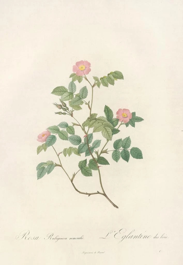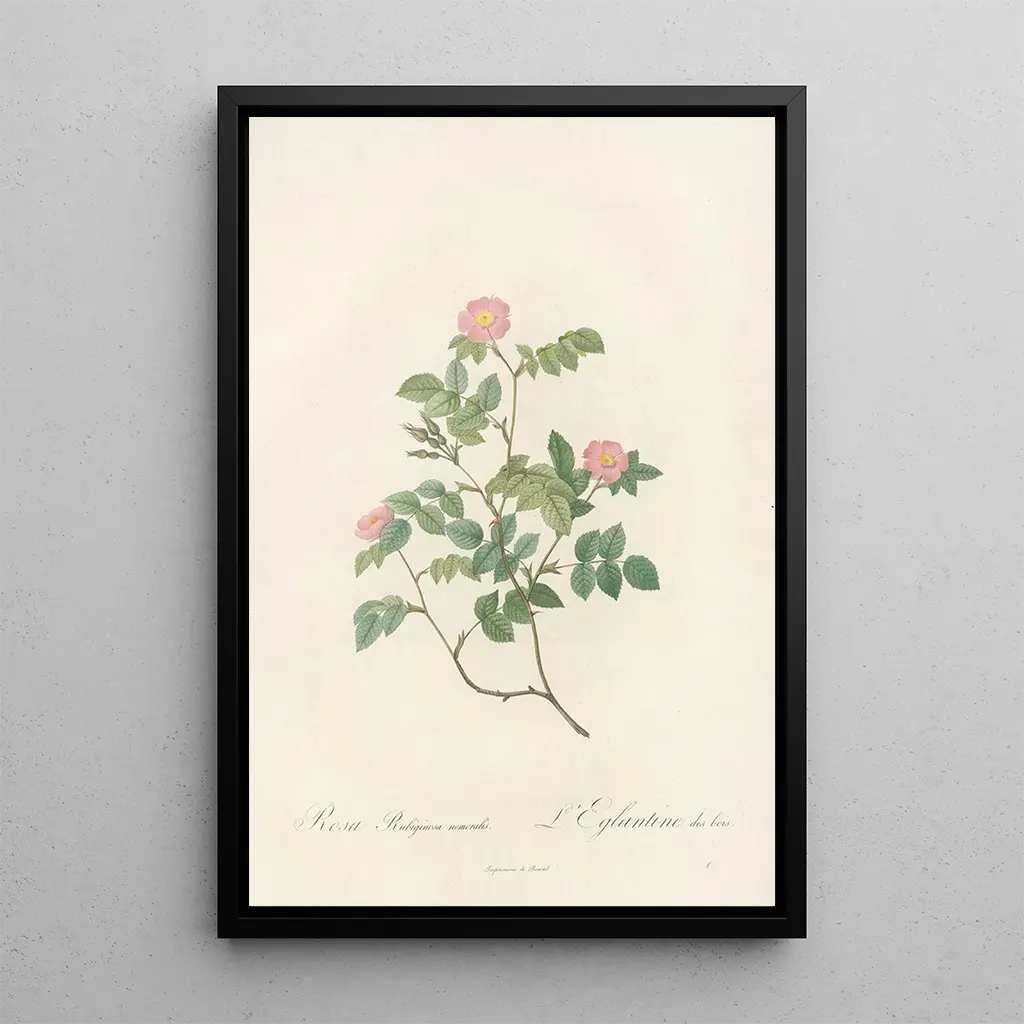 Konsttrycket av Rosa Rubiginosa Nemoralis fångar själva essensen av den vilda skönheten hos rosor, med sina livfulla nyanser och sitt naturliga uttryck. Nyansen av rosa, grönt och brunt blandas för att skapa en harmonisk komposition som framkallar ängar och skogsbryn. Akvarelltekniken, som behärskats av Pierre Joseph Redouté, gör det möjligt att återge lättheten hos blombladen och finheten hos bladen, samtidigt som den ger en djup som fångar ögat. Detta verk inbjuder till en mild och lugnande kontemplation, och hyllar blomsterprakten.