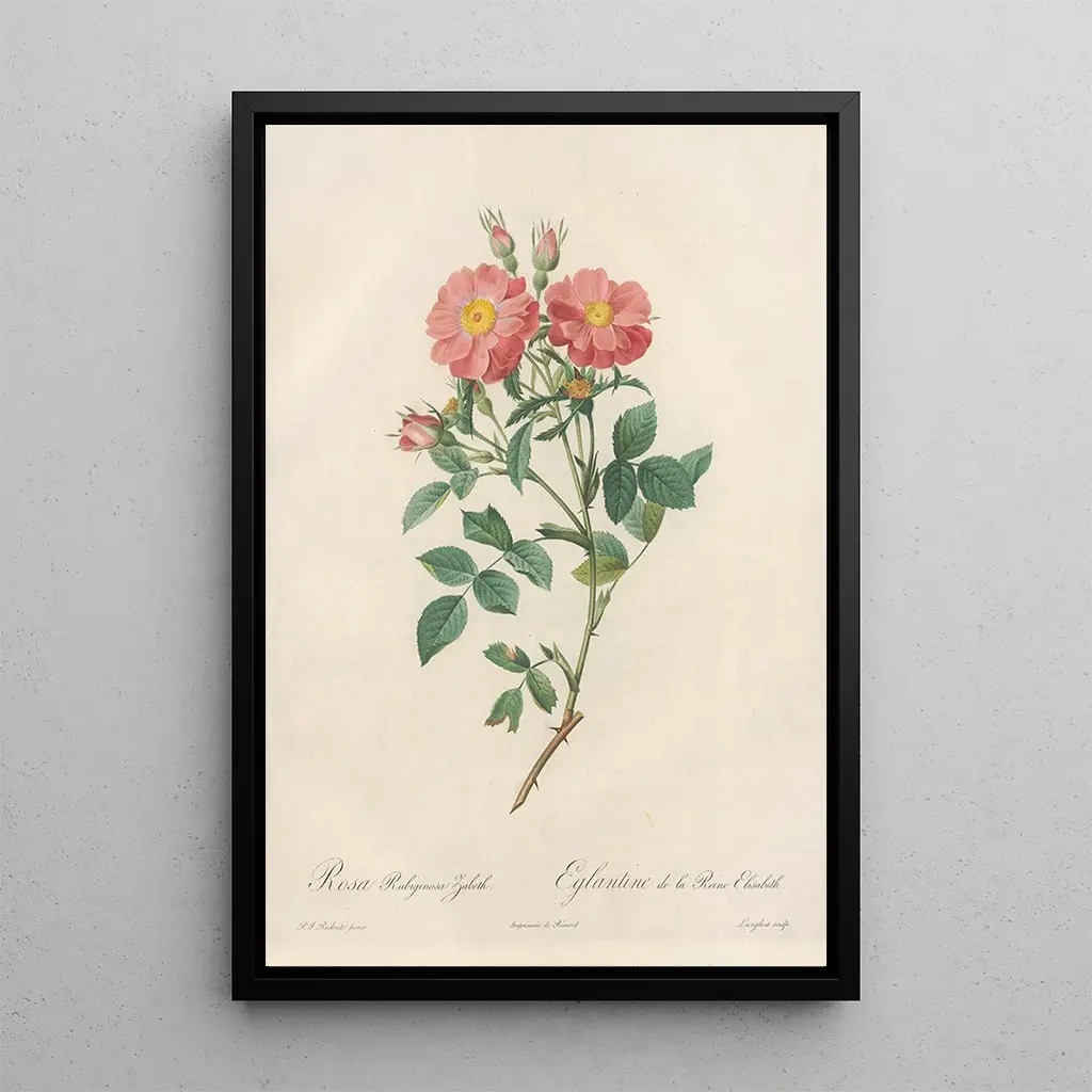 Den konsttryck av Rosa Rubiginosa Zabeth, ett ikoniskt verk av Pierre Joseph Redouté, för oss in i en värld av mildhet och naturlig skönhet. Denna duk, med sina subtila nyanser av rosa och grönt, framkallar en lugn och rofylld atmosfär. Blommans kronblad, noggrant detaljerade, känns nästan påtagliga, medan den subtila bakgrunden framhäver blomans prakt. Redouté, den konstnärliga botanikkonstnären, lyckas fånga själva essensen av denna ros, och avslöjar dess grace och skörhet genom en noggrann teknik och ett skarpt sinne för komposition.