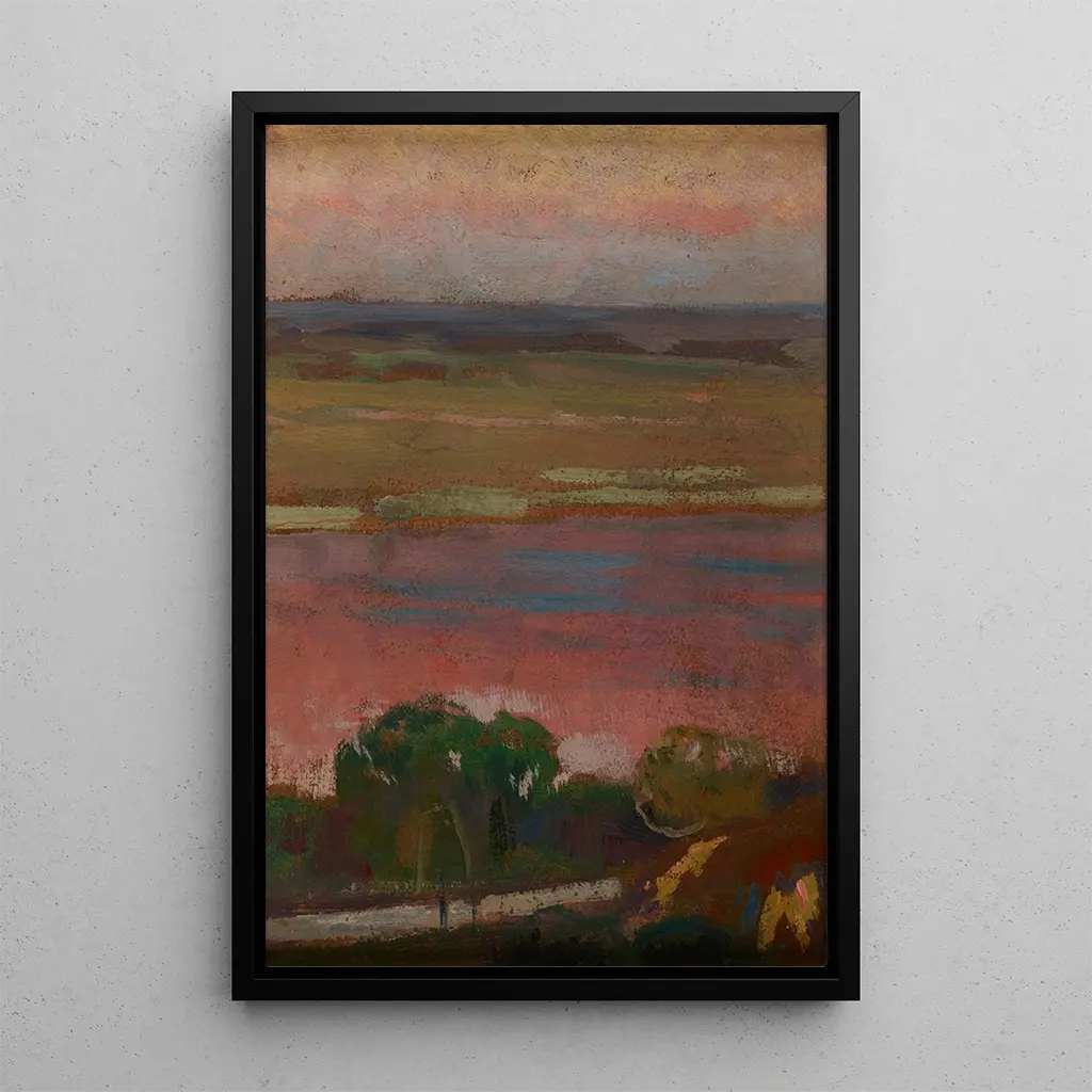 Konsttrycket av Rivière rose förflyttar oss till ett landskap fyllt av lugn. De delikata nyanserna av rosa och blått blandas för att skapa en fridfull och drömmande atmosfär. Akvarelltekniken, med sina subtila tvättar, ger denna målning en nästan eterisk lätthet. Reflektionerna i vattnet, som fångar dagsljuset, inbjuder till en tyst betraktelse, där varje detalj tycks viska naturens hemligheter. Denna tavla framkallar en promenad längs en lugn flod, där tiden tycks stå still, och erbjuder ett ögonblick av flykt för den som betraktar den.