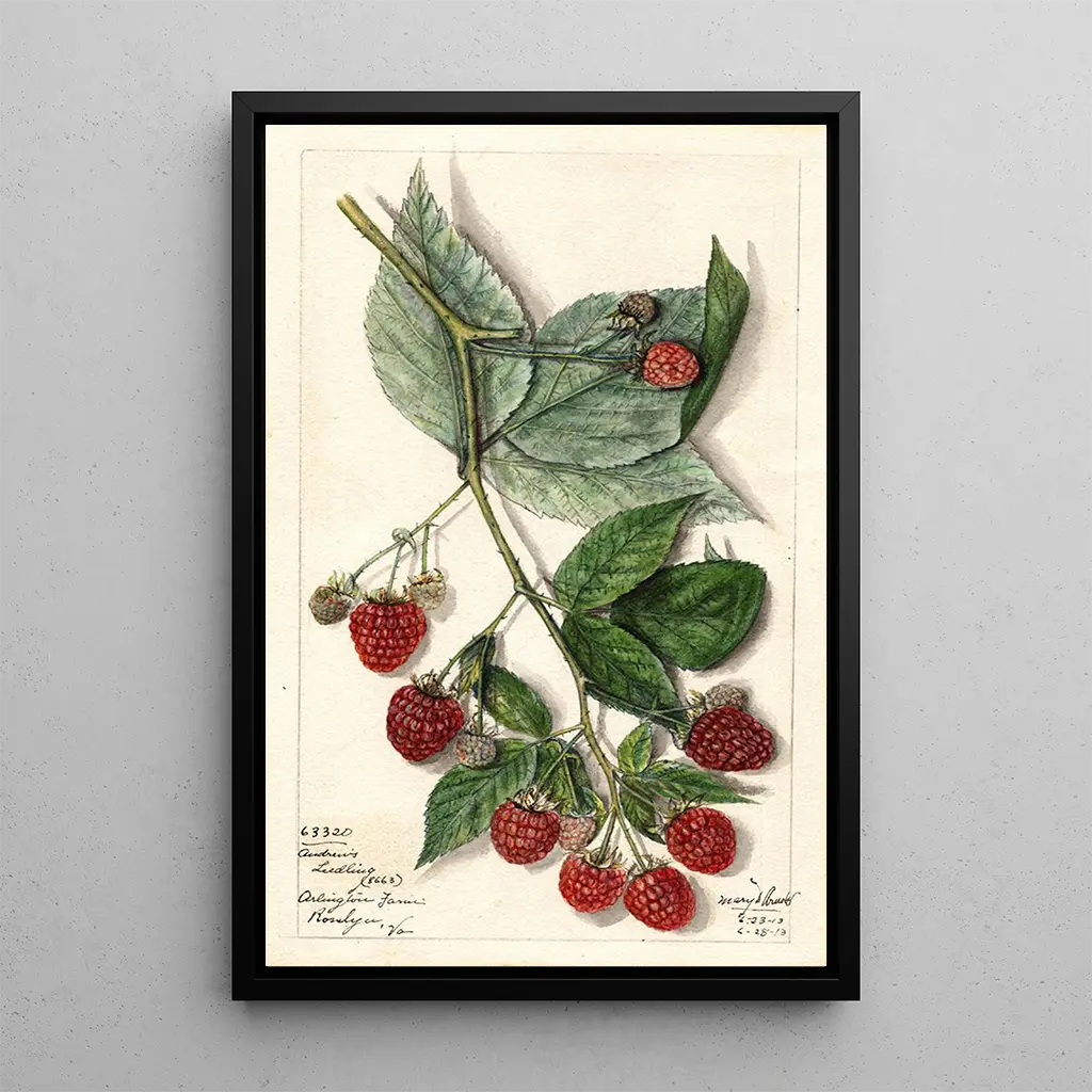 Rubus Andrews-konsttrycket av Mary Daisy Arnold framkallar en känsla av att vara mitt i den vilda naturen, där nyanser av grönt och brunt smälter samman i harmoni. Detta verk, rikt på detaljer, fångar essensen av vildhallon och lövverk, och skapar en atmosfär som är både livfull och lugn. Konstnärens teknik, som kombinerar akvarell och teckning, möjliggör en realistisk återgivning av texturen och djupet i växterna, vilket ger en immersiv visuell upplevelse. Varje element i kompositionen verkar berätta en historia och bjuder in betraktaren att förlora sig i detta frodiga landskap.