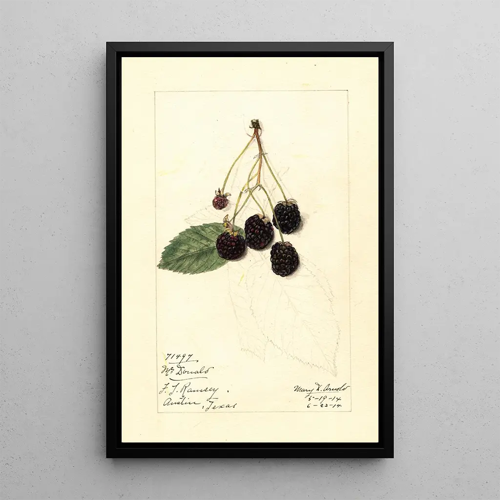 "Rubus McDonald" av Mary Daisy Arnold är ett konsttryck som framhäver den vilda skönheten och naturens rikedom. I denna målning skildrar konstnären med fin känsla törnen och bär, vilket skapar en livfull och dynamisk komposition. De klara färgerna i rött, grönt och lila flätas samman för att ge liv åt scenen, medan konstnärens delikata teknik gör det möjligt att känna texturen av blad och frukter. Atmosfären som utstrålar av detta konsttryck är både glad och lugnande, och inbjuder betraktaren att fördjupa sig i en värld där naturen råder.