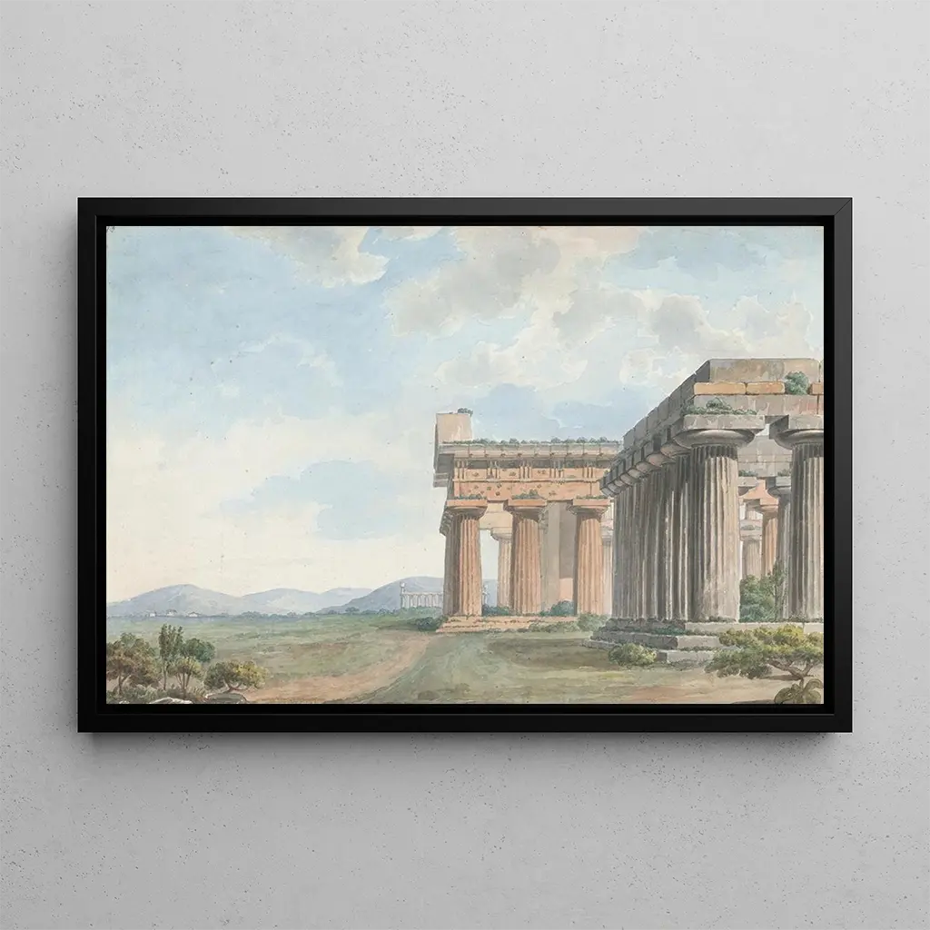 Ruinerna av templet i Paestum: ett eko av det antika förflutna Konsten "Ruinerna av templet i Paestum" framkallar majestätet av resterna av ett gammalt tempel, där de gyllene kolonnerna stolt reser sig mot en klarblå himmel. De jordnära färgerna och nyanserna av grönt i de omgivande landskapen skapar en slående kontrast till den monumentala strukturen, vilket understryker den tidlösa skönheten hos denna historiska plats. Atmosfären som utstrålar av detta konstverk är fylld av lugn och nostalgi, och bjuder in betraktaren att beundra storheten av en svunnen tid. Varje detalj, från de skuggor som faller till texturerna på stenarna, berättar en fascinerande historia. Ruiner av templet i Paestum: ett symbol för klassisk arkitektur Konstnären av "Ruinerna av templet i Paestum", Ruiner av templet i Paestum, ingår i en tradition som hyllar den klassiska arkitekturen och dess inflytande på västerländsk konst. Ruinerna i Paestum, en arkeologisk plats i Italien, har fascinerat många konstnärer och arkitekter genom tiderna. Denna konstnärliga reproduktion vittnar om vikten av antiken i utvecklingen av konstnärlig estetik, samtidigt som den speglar det växande intresset för historiska platser under 1800-talet. Konstnären, genom sin metod, hyllar skönheten och storheten hos dessa rester, samtidigt som de integreras i en modern kontext. En dekorativ konstnärlig reproduktion med många fördelar Reproduktionen av "Ruinerna av templet i Paestum" är ett värdefullt tillskott till varje konstsamling, och tillför en touch av historia och kultur till ditt hem. Oavsett om det är i ett vardagsrum, ett kontor eller ett sovrum, erbjuder denna konstnärliga reproduktion en exceptionell kvalitet som hedrar originalet. Dess estetiska tilltal och dess kontemplativa atmosfär gör den till ett perfekt val för den som vill berika sin inredning. Genom att integrera detta konstverk skapar du ett inspirerande utrymme, där varje blick på konstverket väcker minnen av en avlägsen storhet.
