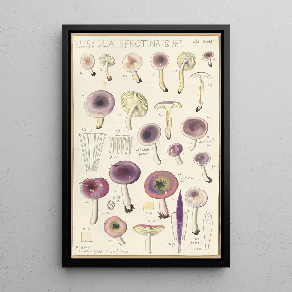 Konsttrycket av Russula serotina Russula myrtilla är ett dekorativt val som kommer att försköna ditt hem, oavsett om det är i ett vardagsrum, ett kontor eller ett sovrum. Dess tryckkvalitet garanterar en exceptionell trohet mot färger och detaljer i originalverket, vilket tillför en touch av elegans och natur till ditt utrymme. Genom att integrera detta konsttryck i din inredning skapar du en varm och välkomnande atmosfär, samtidigt som du hyllar biodiversitetens skönhet. Denna tavla blir därmed en central punkt som väcker beundran och nyfikenhet hos alla som betraktar den.