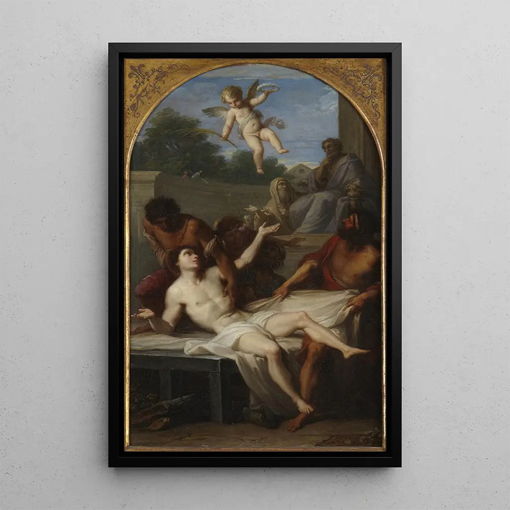 I detta slående verk skildrar Placido Costanzi martyriet av Saint Laurent, ett ögonblick av intensiv tro och lidande. Den dynamiska kompositionen, med figurer i rörelse och dramatiska uttryck, fångar uppmärksamheten och väcker djup känsla. De varma färgerna, särskilt de röda och de gyllene, förstärker scenens allvar samtidigt som de framhäver det gudomliga ljuset som tycks omsluta helgonet. Costanzis teknik, som blandar realism och barocka element, skapar en atmosfär som är både tragisk och andlig, och bjuder in betraktaren att reflektera över offret och tron.