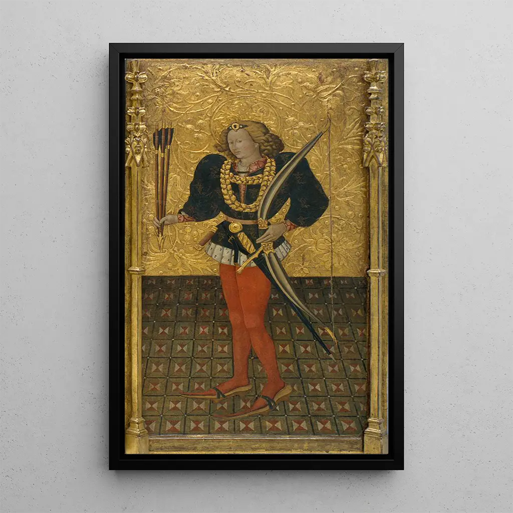 Konsttrycket av Saint Sébastien av Jaume Ferrer fördjupar oss i en scen fylld av andlighet och lidande. De livfulla färgerna, särskilt de röda och guldkantade, kontrasterar mot den bleka kroppen av den martyriserade, och skapar en atmosfär som är både tragisk och sublim. Tekniken i målningen, med sina noggranna detaljer, antyder en enastående mästerskap, medan ljuset verkar leka över ytorna och förstärka scenens känsla. Detta verk inbjuder till djup eftertanke, där betraktaren är både vittne till smärtan och skönheten.