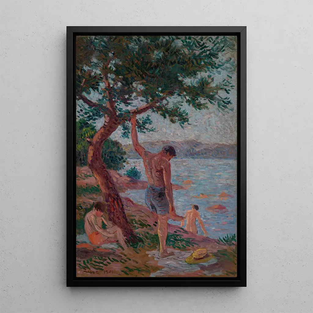 I denna konsttryck av "Saint-Tropez badare under pinetreet" fördjupar Maximilien Luce oss i en livfull och glad sommarscen. Badarna, avbildade med en strålande palett, tycks blomstra under den södra Frankrikes sol. Nyanser av blått och grönt framkallar havet och den omgivande vegetationen, medan färgklickarna tillför dynamik till helheten. Tekniken pointillism, som är karakteristisk för Luce, ger lätthet åt kompositionen och inbjuder betraktaren att känna värmen och gemytligheten i denna soliga dag.