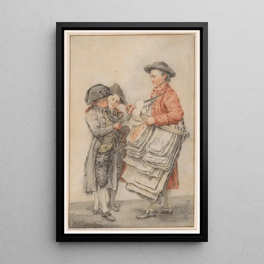 I "Le vendeur d'estampes" ger Jacob Pynas oss en livlig scen som fångar essensen av handel och stadskultur. Denna målning, rik på detaljer, visar en handlare omgiven av sina konsttryck, med livfulla gester och fängslande blick. De varma färgerna och de delikata skuggorna skapar en inbjudande atmosfär, som bjuder in betraktaren att fördjupa sig i denna interaktion mellan konst och publik. Den skickligt balanserade kompositionen framhäver vikten av grafisk konst i vardagen, samtidigt som den avslöjar säljarens passion för sitt yrke.