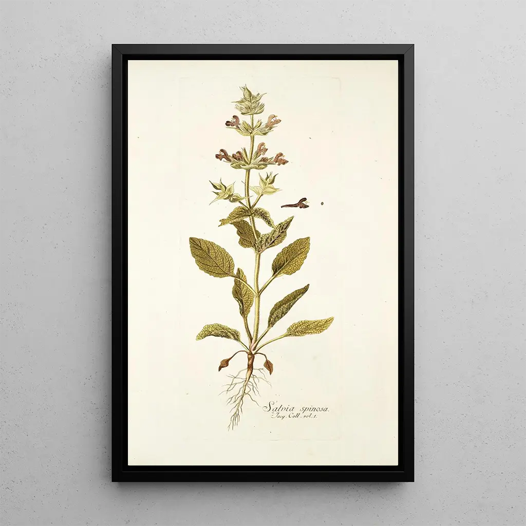 Konsttrycket av Salvia spinosa är ett dekorativt föremål som kan berika alla utrymmen, vare sig det är ett vardagsrum, ett kontor eller ett sovrum. Dess utskriftskvalitet och färgåtergivning gör det till ett perfekt val för den som vill tillföra naturens skönhet till sitt hem. Den estetiska attraktionen hos denna väggbonad ligger i dess balans mellan konst och vetenskap, vilket skapar en fängslande konversation för dem som beundrar den. Genom att välja detta verk, väljer du en elegant och lärorik dekoration, perfekt för botanikkännare och konstälskare.