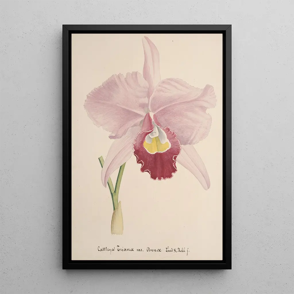 Konsttrycket Collection d'orchidées Pl71 framkallar en frodig trädgård där blommorna blommar i en harmoni av livfulla nyanser. Orkidéerna, varsamt återgivna, känns nästan påtagliga, varje blomblad fångar ljuset på ett sätt som inbjuder till förundran. Nyanser av lila, rosa och vitt blandas med en mildhet som skapar en lugnande atmosfär. Den använda måleritekniken, troligen akvarell eller gouache, möjliggör att återge blommornas transparens och lätthet, medan den suddiga bakgrunden framhäver orkidéernas skönhet och placerar dem i centrum för uppmärksamheten.