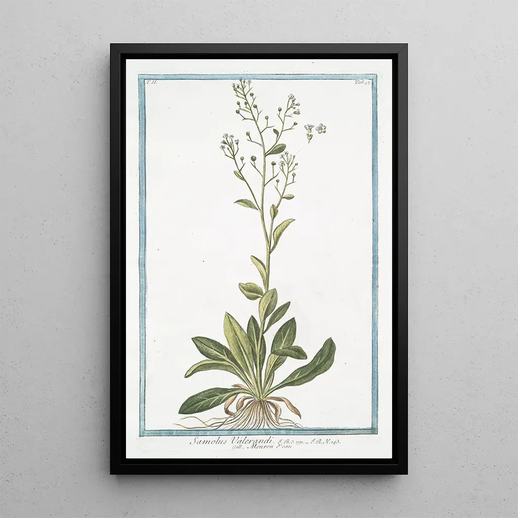 Konsttrycket av verket "Samolus Valerandi Mouron d'eau" av Giorgio Bonelli tar oss till strandkanten av floder och dammar, där denna vattenväxt blomstrar. De delikata vita blommorna, placerade på tunna stjälkar, flyter graciöst ovanför vattnet och skapar en levande och lugnande tavla. Skiftningarna av grönt och blått framkallar friskheten i fuktiga miljöer, medan ljuset leker över ytorna och tillför en nästan magisk dimension till denna naturliga scen. Bonelli, med sitt skarpa öga, lyckas fånga själva essensen av denna växt och erbjuder en rik och immersiv visuell upplevelse.