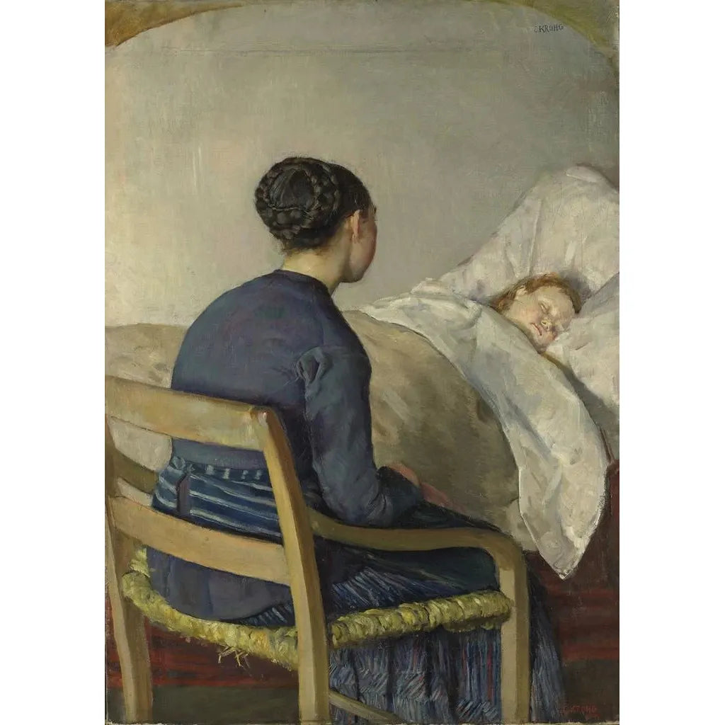 I "Mamma vid barnets sängkant" fångar Christian Krohg ett ögonblick av moderskärlek med en gripande känslighet. Scenen, badad i ett mjukt ljus, framhäver den skyddande siluetten av modern, vars uttryck avslöjar både oro och ovillkorlig kärlek. Pastellfärger, som blandar nyanser av blått och rosa, skapar en lugn och tröstande atmosfär. Krohgs teknik, som förenar realism och känslighet, gör det möjligt att känna djupet i denna unika band mellan mor och barn, vilket förvandlar denna målning till en sann hyllning till moderskapet.