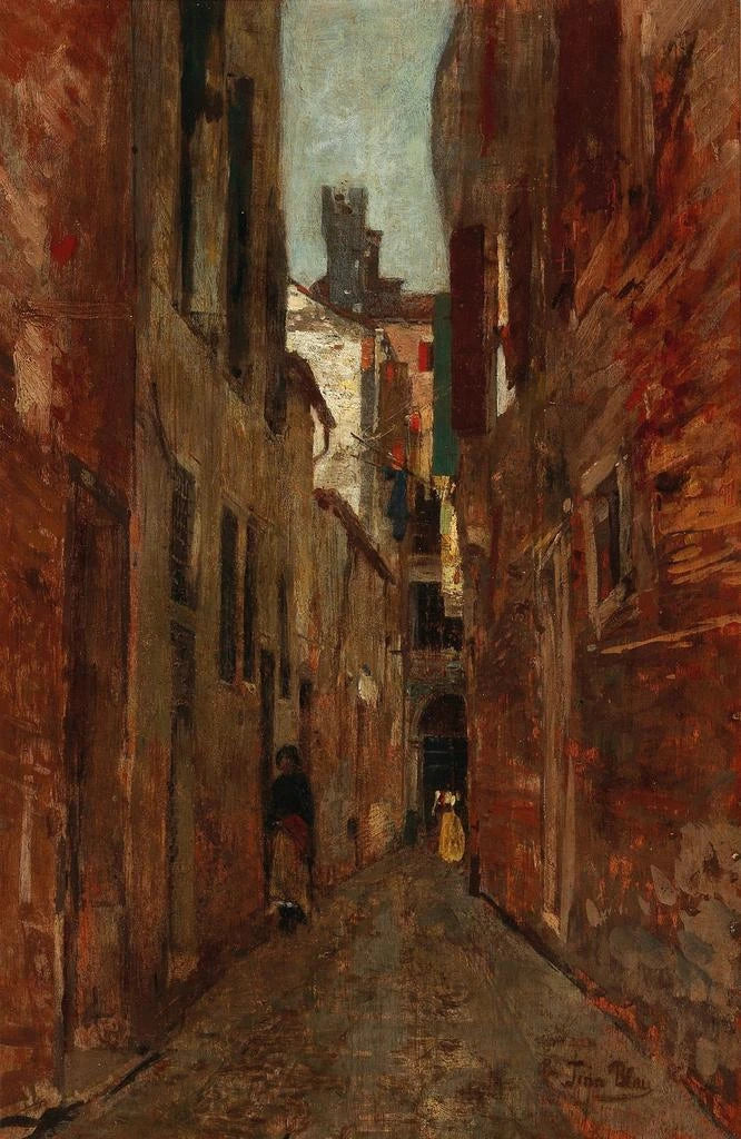 Tina Blau, född 1845, är en av de få kvinnliga konstnärerna som gjort sig ett namn inom impressionismens värld. Påverkad av landskapen från sin barndom och de stora mästarna i sin tid, utvecklade hon en stil som förenar realism och impressionism. "Scen från en gata i Venedig" vittnar om hennes talang att skildra vardagslivet med en särskild känslighet. I en tid då kvinnliga konstnärer ofta var underrepresenterade, banade Blau väg för framtida generationer av konstnärer och gjorde sitt verk till ett värdefullt arv.