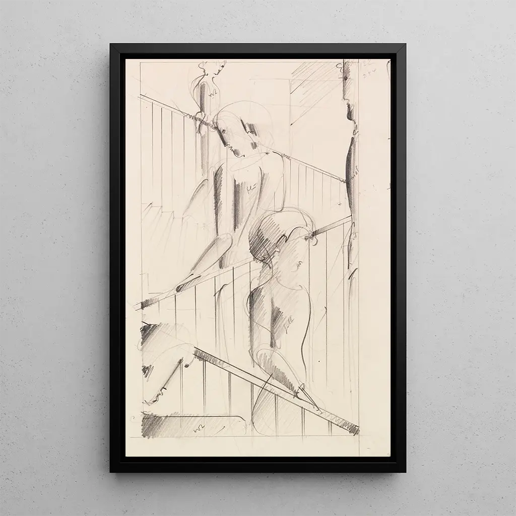 Konsttrycket av målningen Scen på trappan av Oskar Schlemmer framkallar en värld där geometri och rörelse möts. De strikta linjerna och de livfulla färgerna skapar en dynamisk atmosfär, nästan teatralisk. Personerna, stiliserade och sammanflätade i en balett av vinklar, tycks utvecklas i ett utrymme som är både verkligt och abstrakt. Schlemmer, med sin behärskning av former, lyckas fånga essensen av mänsklig rörelse, och förvandlar en enkel scen på trappan till ett vibrerande och fängslande konstverk.