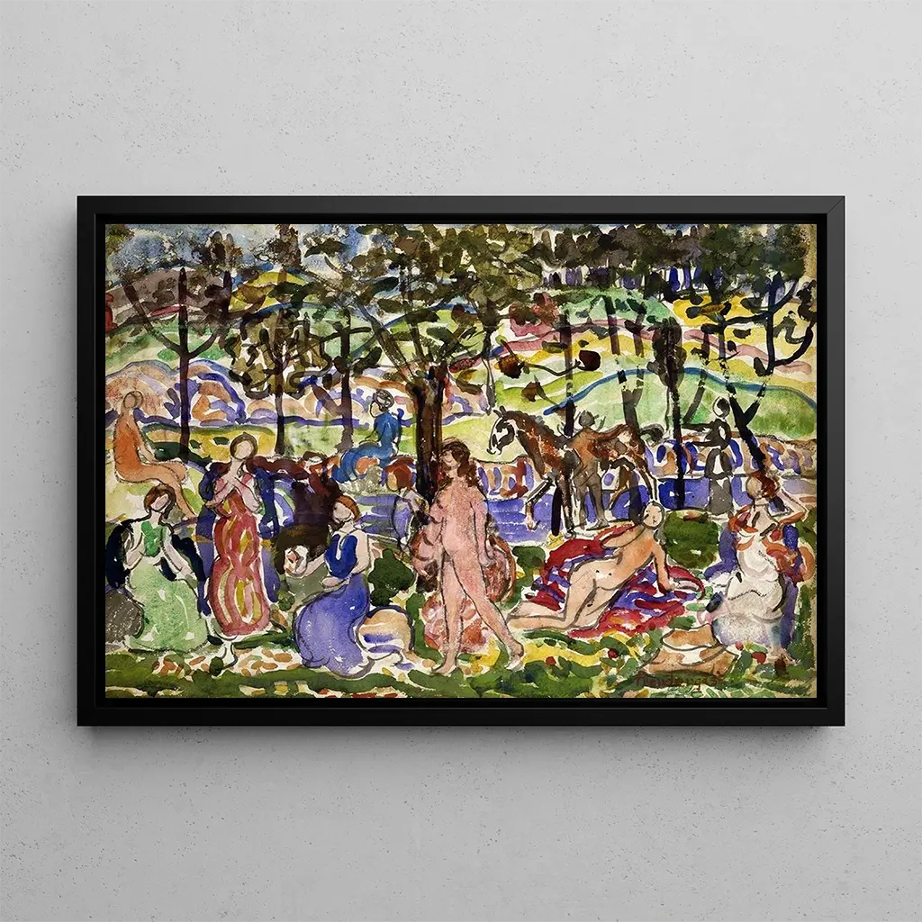 La reproduction de Scène de parc de Maurice Prendergast évoque une atmosphère de sérénité et de joie. Les couleurs vives et lumineuses, typiques de l'artiste, plongent le spectateur dans un univers où la nature et l'humanité coexistent harmonieusement. Les touches de peinture, appliquées avec légèreté, créent un mouvement fluide, comme si le vent caressait les feuilles des arbres. Les personnages, souvent représentés dans des poses détendues, semblent profiter d'un moment de répit, invitant à la contemplation et à l'évasion. Cette toile, pleine de vie, capte l'essence d'une journée ensoleillée, où le parc devient un lieu de rencontre et de partage.