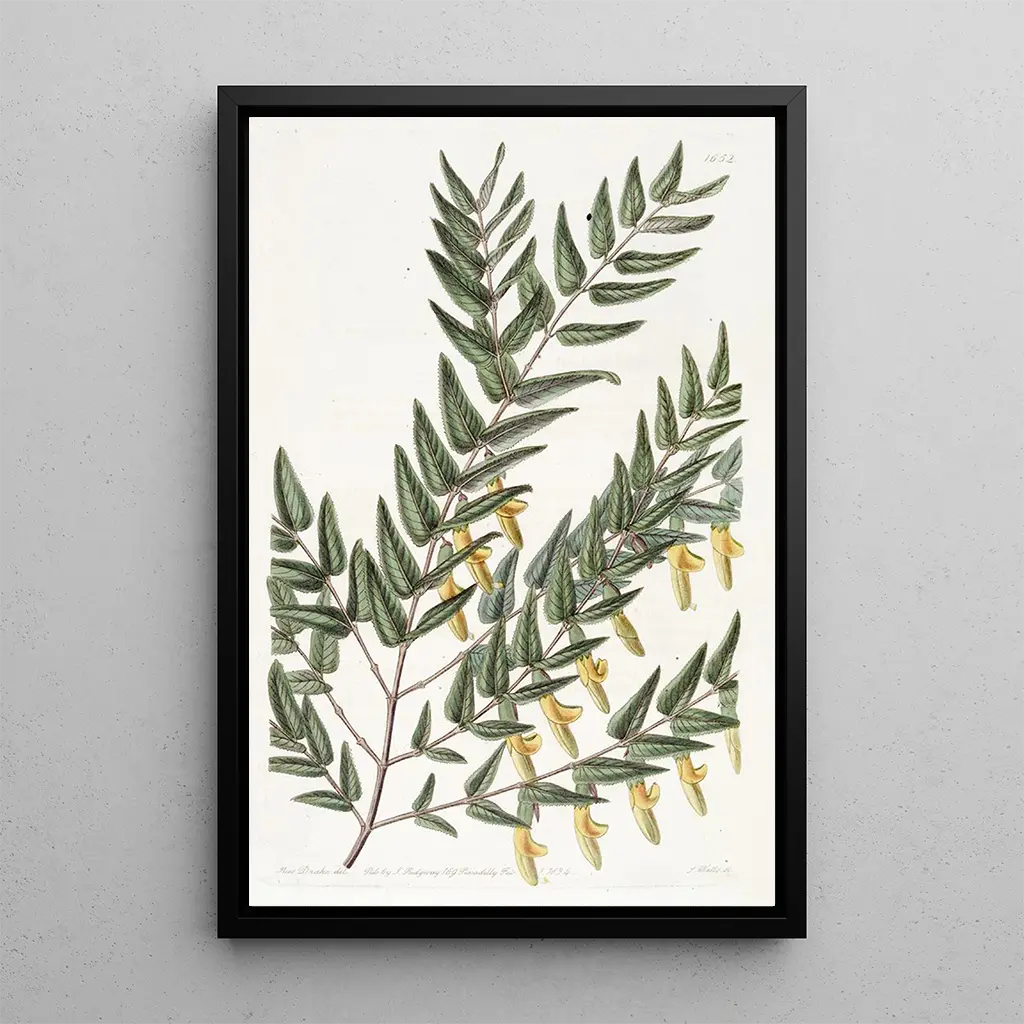 Konsttrycket av Scottia à branches lisses, skapad av Sydenham Edwards, fördjupar oss i en värld där naturen uttrycker sig med kraft och elegans. De flytande linjerna av grenarna, kombinerade med livfulla nyanser, skapar en harmonisk komposition som drar till sig blickar. Varje detalj är noggrant återgiven, vilket vittnar om konstnärens skicklighet att fånga själva essensen av denna växt. Atmosfären som förmedlas av denna målning framkallar både robusthet och finhet, och inbjuder till en visuell utforskning av botaniska underverk. Det är en sann hyllning till floran, som väcker sinnena och inspirerar till eftertanke.