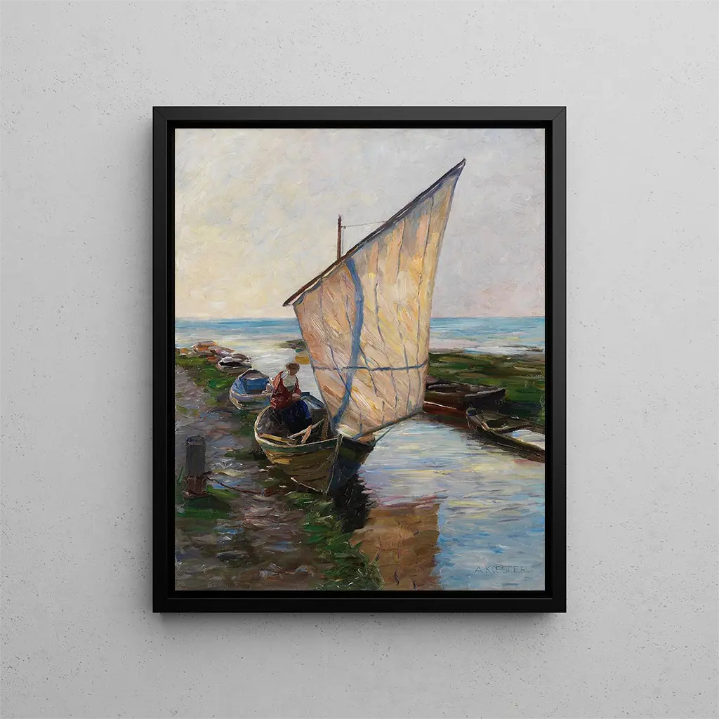 Konsttryck Voilier Hollande - Alexander Koester – Introduktion fängslande Dyka ner i den marina värld, "Voilier Hollande" av Alexander Koester framkallar en scen fylld av lugn och rörelse. Denna konsttryck, som fångar själva essensen av segling på Nordsjön, förflyttar betraktaren till ett landskap där himmel och vatten smälter samman. De vita seglen på båtarna, fyllda av vinden, reser sig majestätiskt mot en molnig bakgrund, vilket skapar en slående kontrast som inbjuder till eftertanke. Koester, med sin obestridliga talang, lyckas förmedla en atmosfär som är både fridfull och dynamisk, vilket gör att varje person kan känna kallelsen till de stora marina utrymmena. Stil och unikhet i konstverket Alexander Koesters konst utmärker sig genom sin förmåga att kombinera realism och impressionism. I "Konsttryck Voilier Hollande" blandas de noggranna detaljerna av segelbåtar med en mer fri tolkning av de naturliga elementen. Nyanser av blått, grått och vitt vävs samman för att skapa en visuell harmoni som påminner om ljusets reflektioner på vattnet. Penseldragen, både delikata och kraftfulla, ger liv åt duken. Koester nöjer sig inte med att reproducera ett landskap; han tolkar det, och erbjuder en personlig och poetisk vision av havet. Detta konsttryck utmärker sig genom sin förmåga att fånga ett flyktigt ögonblick, en stund av naturlig skönhet som tycks vara upphängd i tiden. Konstnären och hans inflytande Alexander Koester, född 1858 i Berlin, är erkänd som en av de främsta mästarna inom marinlandskap på 1800-talet. Påverkad av de stora mästarna inom målarkonsten utvecklar han en egen stil, som kombinerar noggrann teknik med konstnärlig känsla. Hans passion för havet och segling lyser igenom i hans verk, där han utforskar teman som vatten och ljus med en oöverträffad djup. Koester lyckades etablera sig på sin tids konstscen, inspirerande många samtida och framtida konstnärer att utforska skönheten i marina landskap. Hans arv består, och vittnar om naturens betydelse i konsten och konstnärens förmåga att framkalla känslor genom scener ur vardagen. En enastående väggdekoration signerad Artem Legrand Den