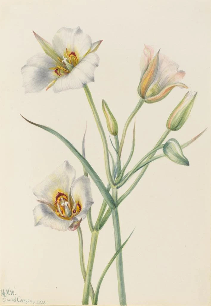 Mary Vaux Walcott, aktiv i början av 1900-talet, är erkänd för sina bidrag till amerikansk botanisk konst. Påverkad av naturalistiska rörelser och den växande betydelsen av naturvård, lyckades hon kombinera vetenskaplig precision med konstnärlig känslighet. Hennes verk, inklusive konsttrycket av Ségo Lily Calochortus nuttallii, vittnar om en tid då naturen hyllades genom konst. Walcott deltog också i expeditioner i den amerikanska västern, vilket gav henne möjlighet att fånga sällsynta arter och öka allmänhetens medvetenhet om den lokala florans skönhet.