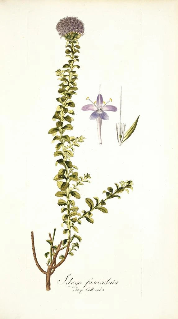 Nikolaus Joseph Freiherr von Jacquin, en framstående figur från 1700-talet, lyckades förena konst och vetenskap genom sina botaniska illustrationer. Hans arbete påverkades av de vetenskapliga upptäckterna under hans tid, vilket gjorde det möjligt för honom att upptäcka och avbilda mindre kända växtarter. Selago fasciculata är ett av hans många verk som vittnar om hans talang och engagemang för botanik. Som en pionjär inom vetenskaplig illustration banade Jacquin väg för en bättre förståelse av växter, samtidigt som han hyllade deras inneboende skönhet.