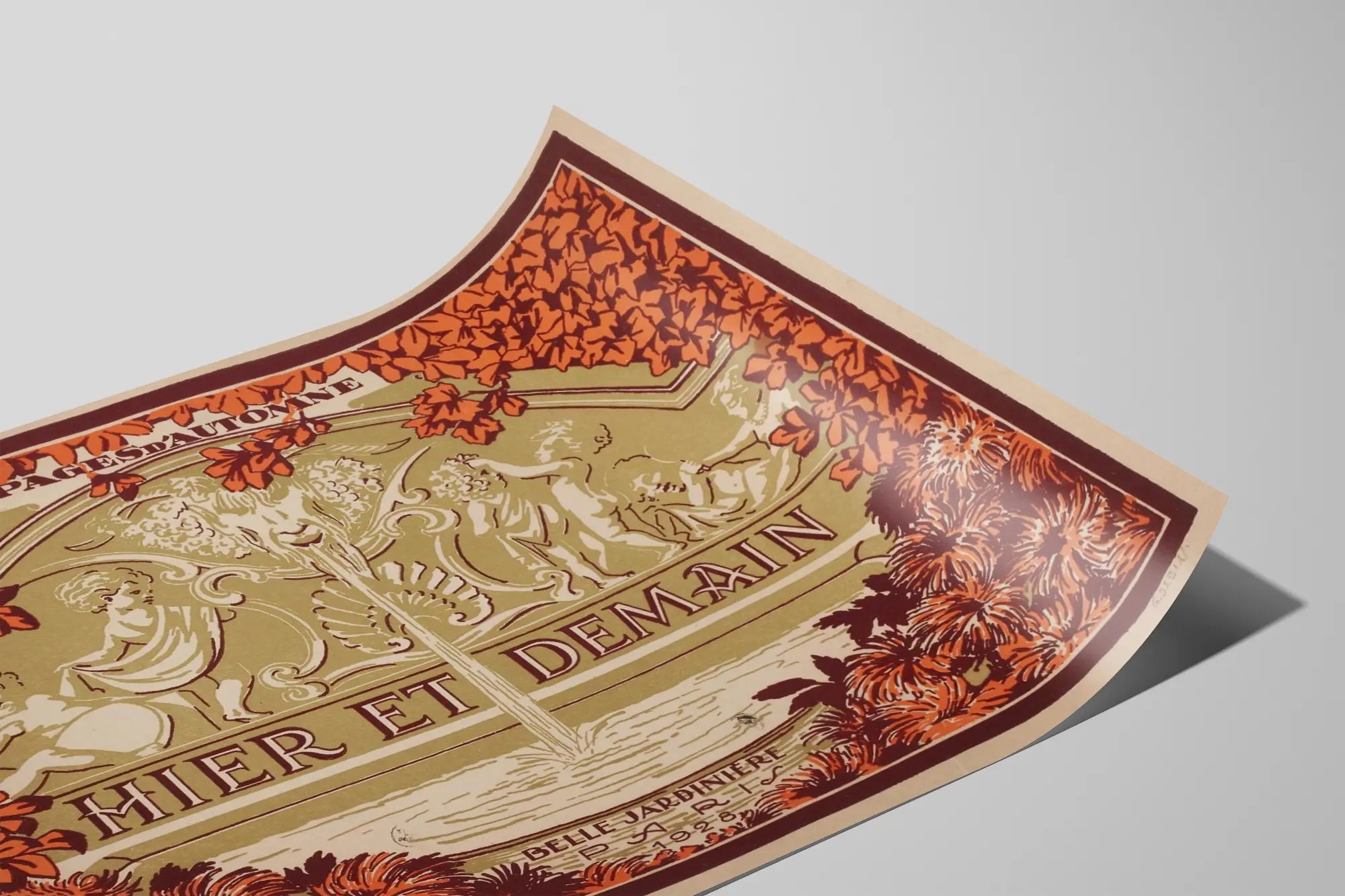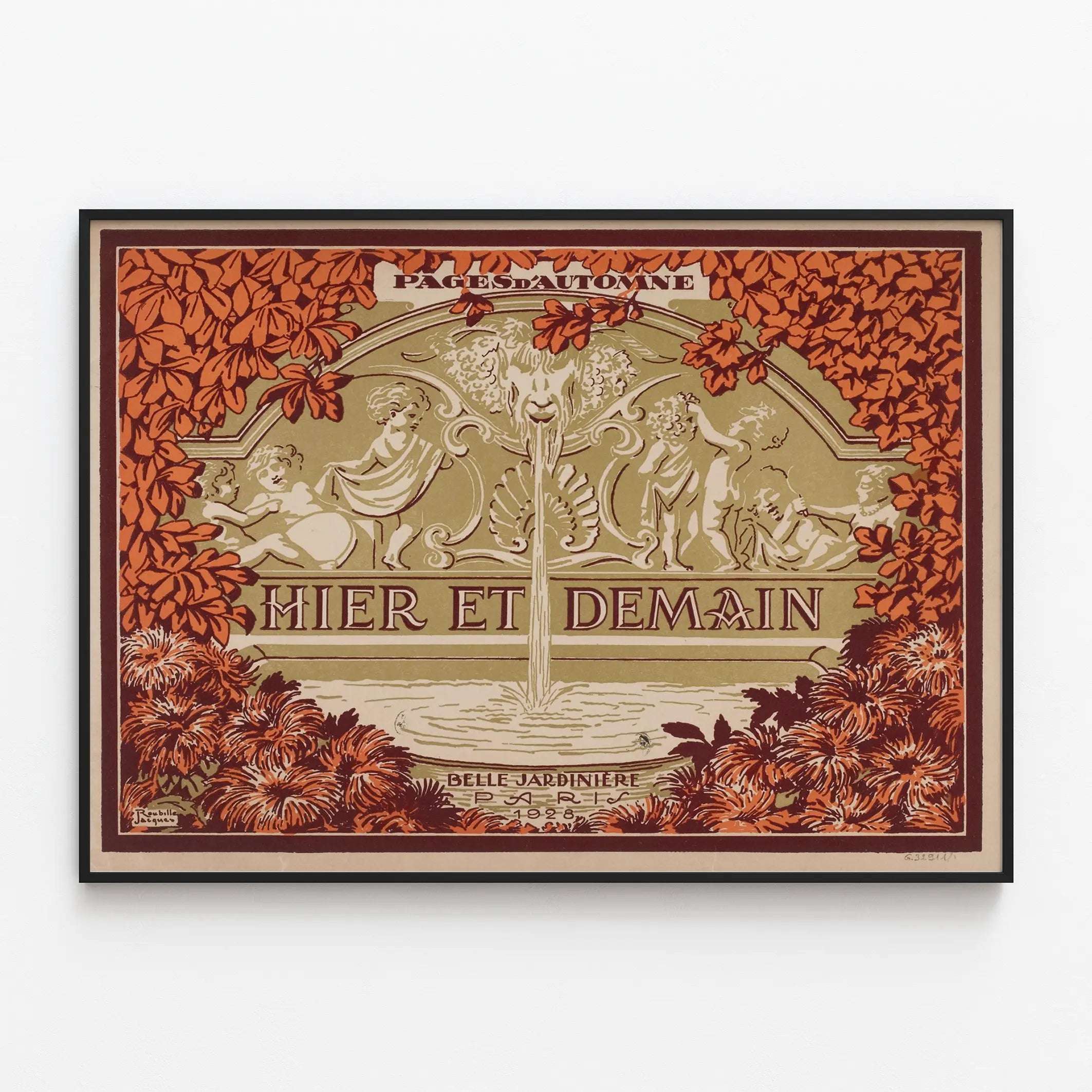 Den vintageaffisch med titeln "Höstens sidor – Igår och Imorgon" återspeglar med elegans den höstliga årstidens anda genom en rik och harmonisk grafisk komposition. Inramad av röda höstlöv och varma blomster, visar denna väggdekoration en central skulpturerad fontän, runt vilken stiliserade barn rör sig i en klassisk anda. De ockra, röda och beige tonerna dominerar bilden och ger en visuell värme, perfekt för att dekorera ett inre som söker en retro och konstnärlig atmosfär.