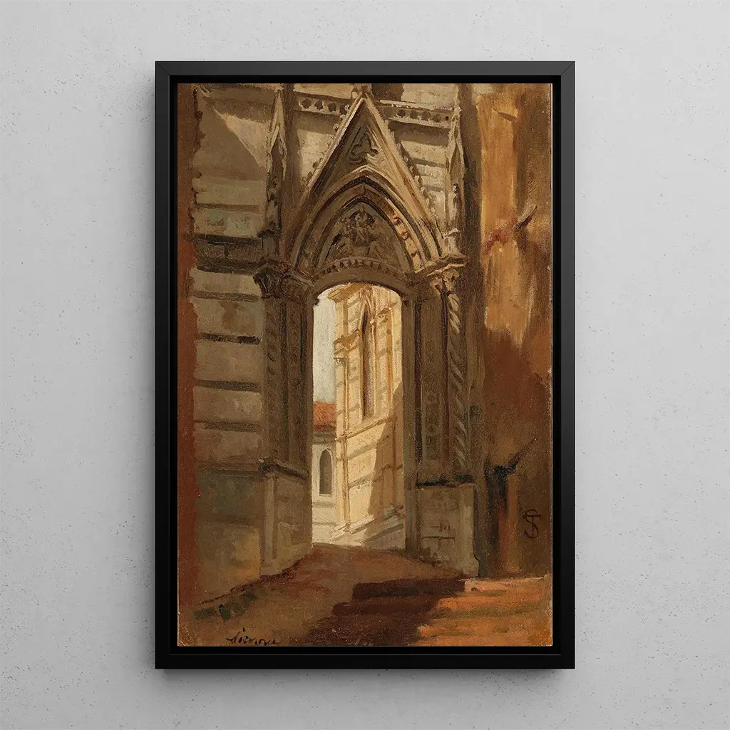 Siennas katedral, fångad av Telemaco Signorini, framkallar en mystisk atmosfär där ljuset leker med skuggorna. De arkitektoniska detaljerna, noggrant återgivna, avslöjar storheten hos denna ikoniska byggnad. De varma och jordnära färgerna, typiska för den toskanska paletten, blandas harmoniskt och skapar en känsla av tidlöshet. Kompositionen, både dynamisk och balanserad, inbjuder betraktaren att fördjupa sig i den heliga världen av katedralen, där varje sten verkar berätta en historia. Signorini, med sin oljemålningsteknik, lyckas förmedla den känsla och andlighet som utstrålar från detta ställe.