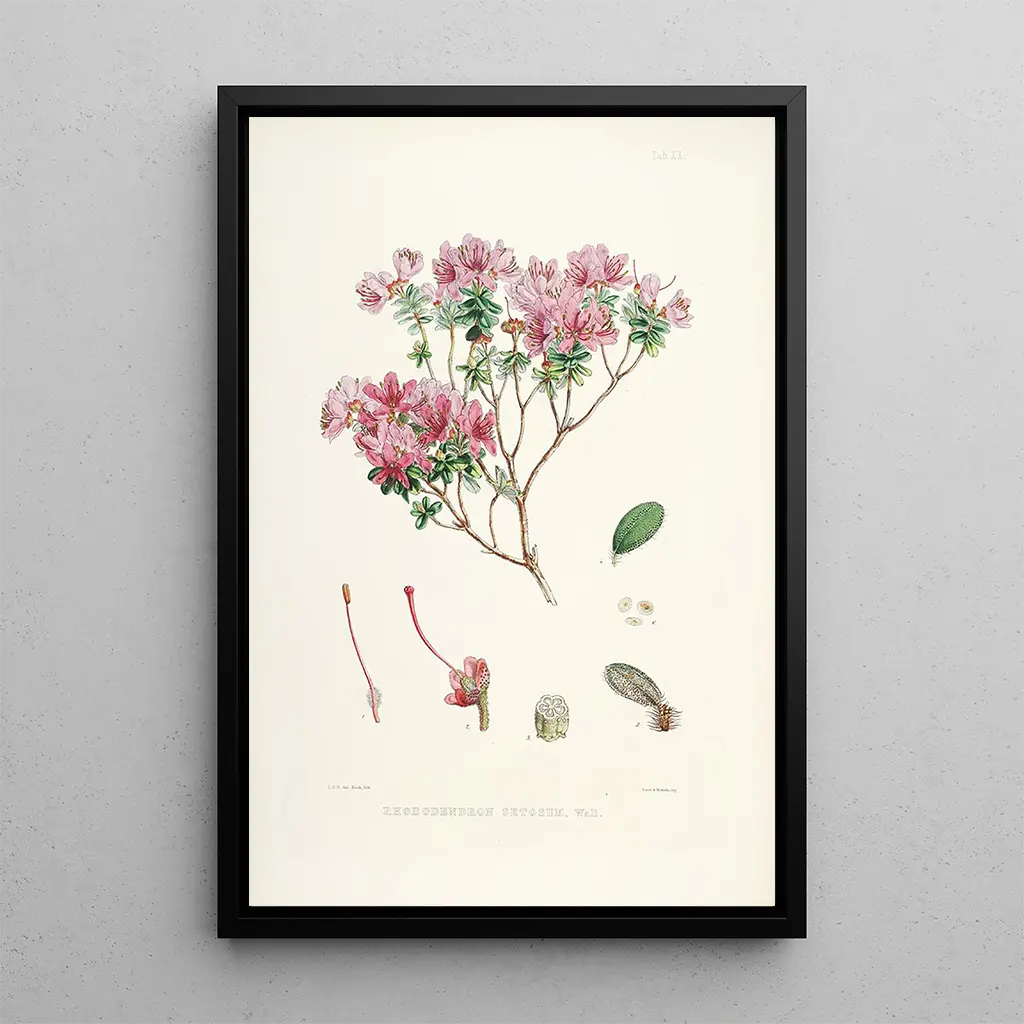 Dans cette œuvre vibrante, Walter Hood Fitch capture la beauté éphémère des rhododendrons, emblématiques de l'Himalaya. Les nuances éclatantes de rose, de violet et de blanc se mêlent harmonieusement, créant un tableau qui évoque la richesse de la flore alpine. La technique de l’aquarelle, utilisée avec maîtrise, permet de rendre la délicatesse des pétales et la luminosité des feuillages. L’atmosphère qui se dégage de cette konsttryck est à la fois sereine et vivifiante, invitant le spectateur à plonger dans un monde naturel luxuriant où chaque détail est soigneusement observé.