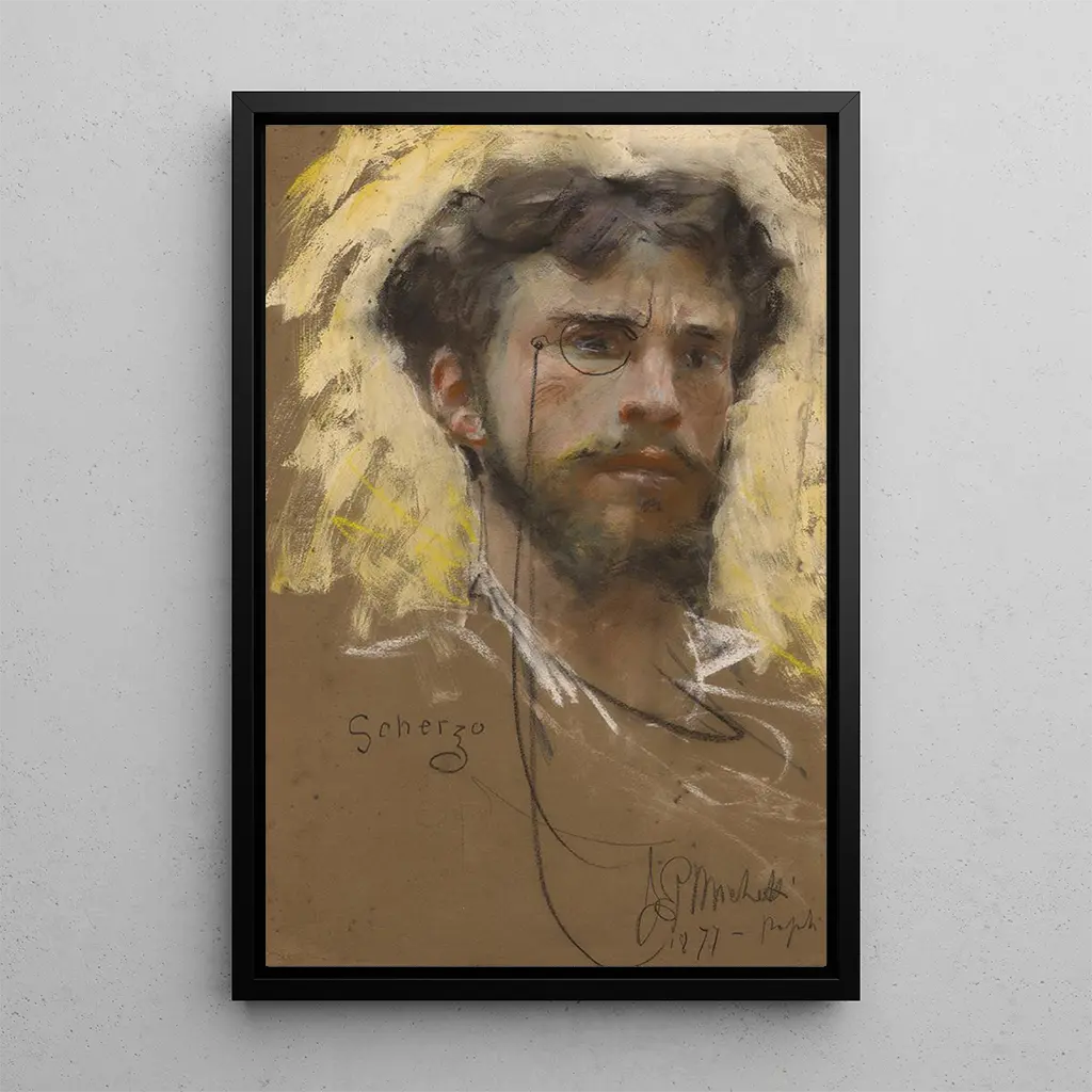 Autoportrait : en vibrerande introspektion L'autoportrait av Francesco Paolo Michetti är ett fängslande verk som fördjupar betraktaren i konstnärens privata värld. Kompositionen, centrerad kring Michettis uttrycksfulla ansikte, använder varma färger och jordnära nyanser som framkallar en atmosfär av äkthet och djup. Tekniken med oljemålning, med sina delikata penseldrag, möjliggör att fånga ansiktets detaljer och ljusspel på huden, vilket skapar en emotionell koppling till betraktaren. Detta konsttryck, en sann spegel av själen, inbjuder till eftertanke och reflektion kring identitet och konst. Francesco Paolo Michetti : en mästare av italiensk realism Francesco Paolo Michetti, född 1851, är en ikonisk italiensk konstnär inom realismrörelsen. Påverkad av de stora mästarna från renässansen och av landskapen i hans hemregion Abruzzo, lyckades han fånga vardagslivet med en unik känslighet. Michetti var också en passionerad förespråkare för folkkonsten, och strävade efter att skildra kultur och traditioner från sitt land. Hans verk markerade slutet på 1800-talet, en period då italiensk konst förnyades, och hans inflytande består än idag, vilket gör honom till en oumbärlig figur i konsthistoriens värld. En dekorativ förvärv med många fördelar Att välja konsttrycket av Autoportrait av Francesco Paolo Michetti är att välja ett föremål som berikar varje levande utrymme. Oavsett om det är i ett vardagsrum, ett kontor eller ett sovrum, tillför detta konsttryck en känsla av äkthet och karaktär. Kvaliteten på konsttrycket garanterar en trohet mot färger och detaljer i originalverket, samtidigt som det erbjuder en oemotståndlig estetisk attraktion. Genom att integrera detta mästerverk i din inredning skapar du en inspirerande miljö, som främjar kreativitet och eftertanke.