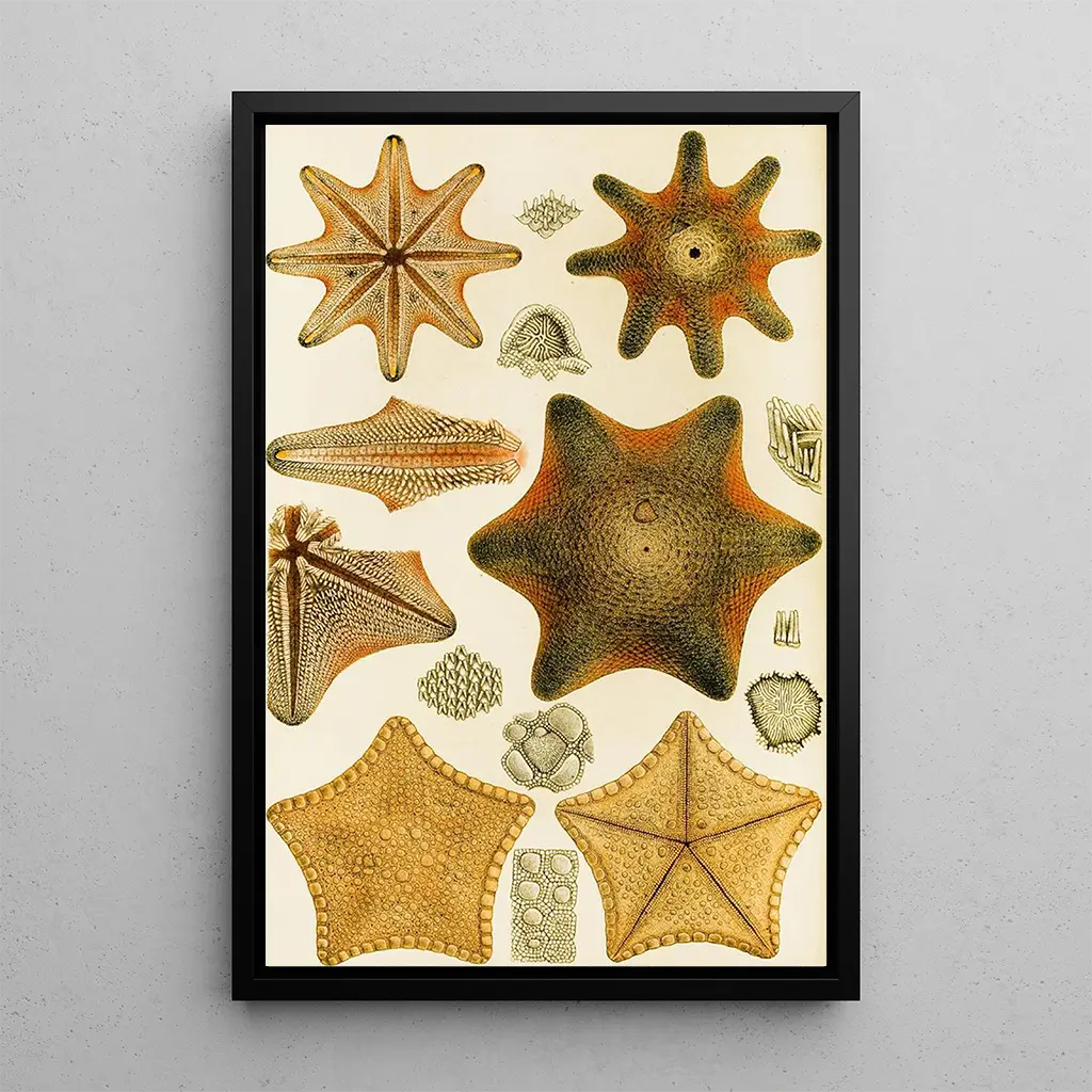 Échinodermes : en utforskning av marina underverk Konsttrycket av Échinodermes för oss in i en fascinerande värld där den marina mångfalden lyfts fram. Frederick McCoy, med sitt skarpa blick, illustrerar dessa varelser med unika former och slående färger. Nyanser av lila, gult och turkost blandas harmoniskt, vilket skapar en komposition som fångar ögat och stimulerar fantasin. Den delikata akvarelltekniken gör det möjligt att återge texturen hos echinodermerna, och skapar en atmosfär som är både realistisk och poetisk, perfekt för avkoppling och inspiration. Frederick McCoy : en konstnär i skärningspunkten mellan konst och vetenskap Frederick McCoy, naturforskare och illustratör, präglade 1800-talet med sina verk som förenar vetenskaplig precision och konstnärlig känsla. Hans utbildning vid University of Melbourne och hans resor har gett honom möjlighet att noggrant observera och dokumentera det marina livet. McCoy lyckades fånga essensen av echinodermerna, vilket visar deras vikt i det marina ekosystemet. Hans illustrationer, inklusive konsttrycket av Échinodermes, anses vara referenser inom vetenskaplig illustration, där noggrannhet möter estetik. Ett dekorativt inköp med många fördelar Konsttrycket av Échinodermes är ett perfekt dekorativt val för att berika ditt hem, oavsett om det är i vardagsrummet, på kontoret eller i sovrummet. Dess utskriftskvalitet garanterar en exceptionell trohet mot detaljer och de livfulla färgerna i originalverket, vilket gör detta konsttryck till ett verkligt konstnärligt smycke. Genom att integrera detta konsttryck i ditt utrymme tillför du en touch av originalitet och elegans, samtidigt som du hyllar de marina underverkens skönhet. Denna tavla är inte bara en dekorativ detalj, utan också en källa till inspiration och reflektion över den biologiska mångfalden som omger oss.