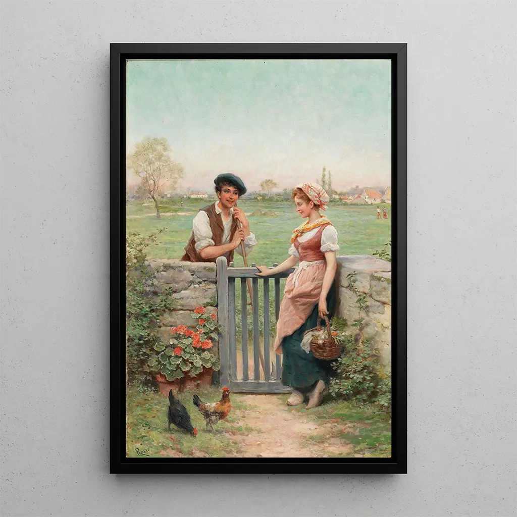 I denna konsttryck av Badinage à la clôture fångar Lucius Rossi ett ögonblick av lätthet och samförstånd mellan två personer. Kompositionen domineras av mjuka och naturliga färger, som framkallar värmen av en solig eftermiddag. De noggranna detaljerna i kläder och uttryck hos huvudpersonerna tillför en levande dimension till målningen. Rossis teknik, som skickligt blandar realism och en impressionistisk touch, skapar en atmosfär av gemytlighet och lugn, och förflyttar betraktaren till en värld där tiden tycks stå stilla.