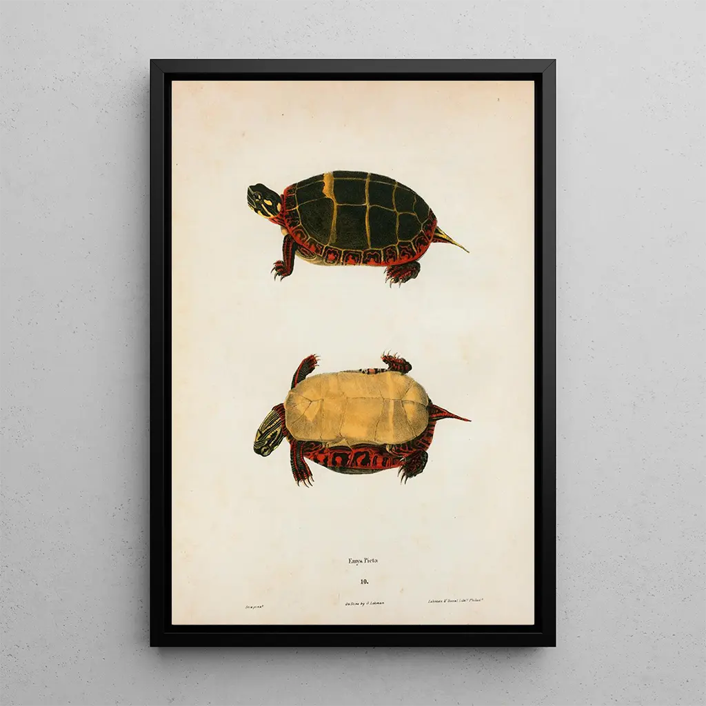 Konsttrycket av Tortuledentelée, ett ikoniskt verk av John Edwards Holbrook, för oss in i en fascinerande värld där naturens skönhet avslöjas med subtilitet. De noggrant utarbetade detaljerna på skalet, prytt med komplexa mönster, fångar ljuset på ett sätt som framkallar lugnet i vattenmiljöer. De gröna och bruna nyanserna blandas harmoniskt och skapar en lugnande atmosfär. Akvarelltekniken, som används med mästerskap, hyllar detta majestätiska djur samtidigt som den bjuder in betraktaren till en djup och respektfull kontemplation av naturen.