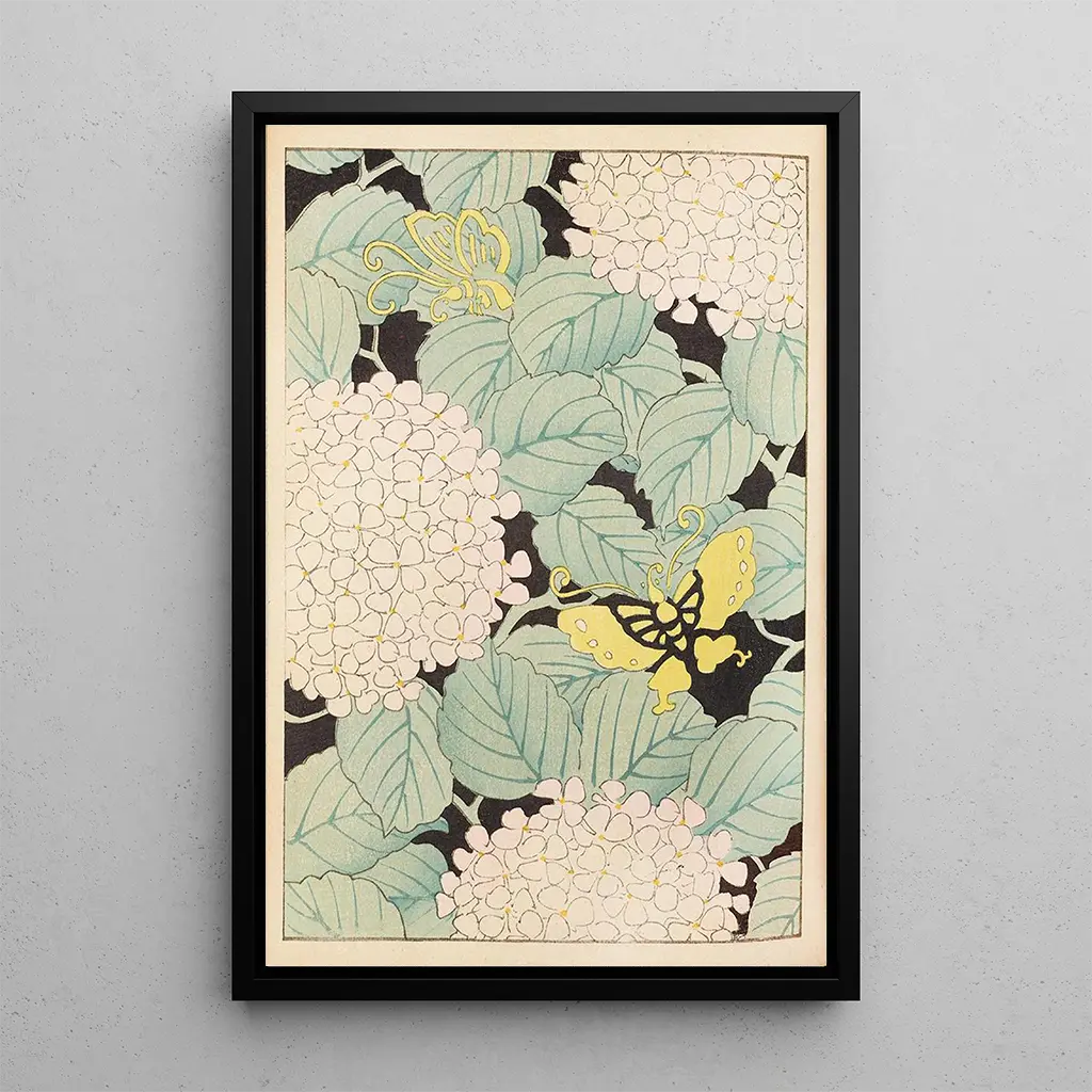 Konsttrycket av Bijutsukai Pl169 förflyttar oss till en hemlig trädgård där blommorna blommar i en färgstark dans. De livfulla och ljusa nyanserna vävs samman och skapar en levande tavla som fångar ljuset på ett förtrollande sätt. Furuya Korins teknik, som kombinerar finhet och precision, gör det möjligt att känna ömtåligheten hos blombladen och friskheten hos bladen. Varje detalj är noggrant utarbetad och bjuder in betraktaren att fördjupa sig i denna frodiga natur. Detta verk är en äkta hyllning till blommornas flyktiga skönhet, fångad med en exceptionell konstnärlig känsla.